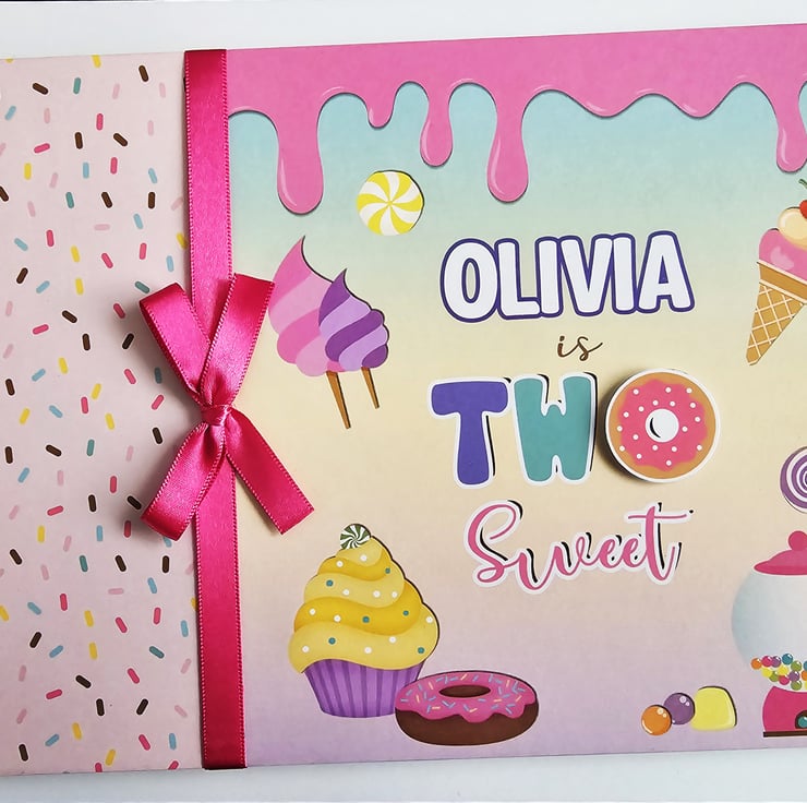 This Baby Shower Guest Book (First Birthday Book) is decorated with embellishments and a ribbon.