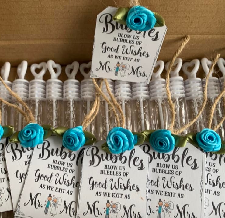 Handmade printed cards by myself handmade punched holes and threaded with jute string with a Handmade rose you can choose one colour only or two colours of your choice.All attached with string on them and the rose attached for you to attach yourself to the bubble wands.