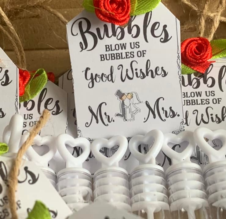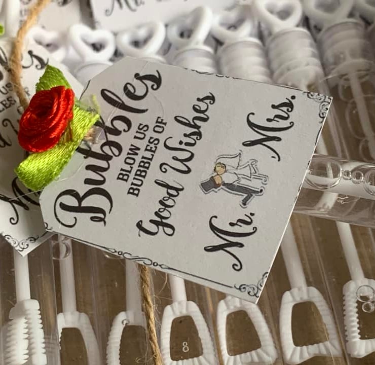 Handmade card signs made by myself and bows attached to the cards with jute string and bubble wand bubbles Please realise that the personlisation is for the colour of the ribbon (ONLY) I Can only print the Mr & Mrs Tag only in the picture.