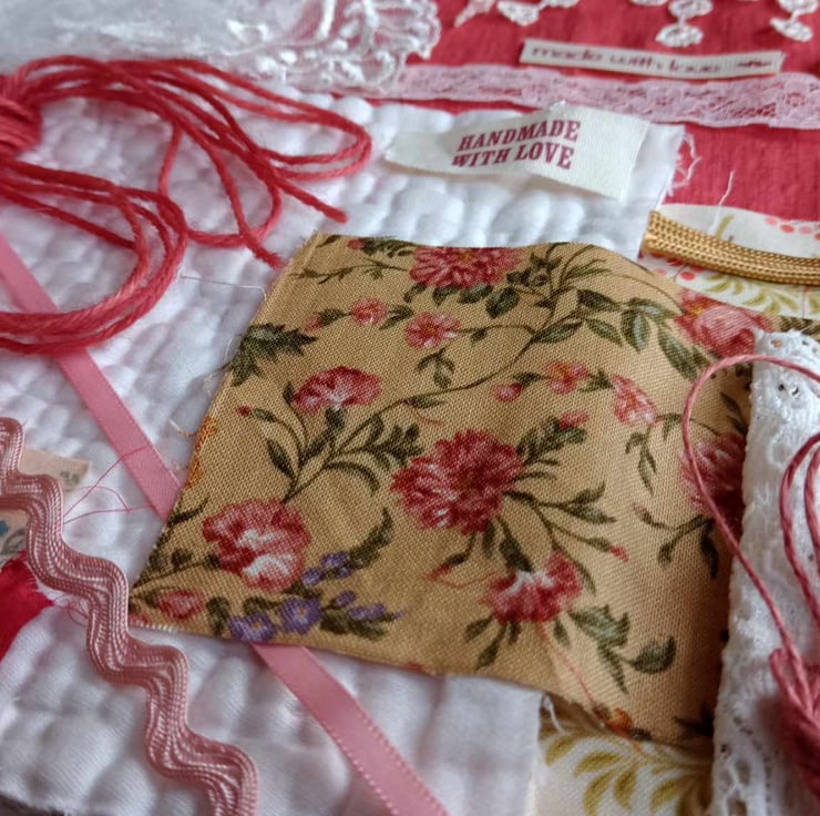 The photos are from my full-theme kits, and show examples of the fabrics and haberdashery you wil receive.