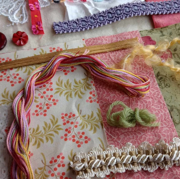 A glorious mix of silks and lace - these lovely bundles of fabrics and trims have been put together using bits and pieces left over from my more specific slow stitching kits.