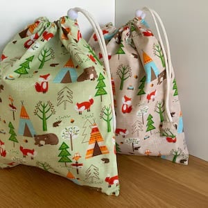 Drawstring wash bag, toiletry bag. Cotton exterior with nylon waterproof lining and fitted with a toggle to hold the bag closed.