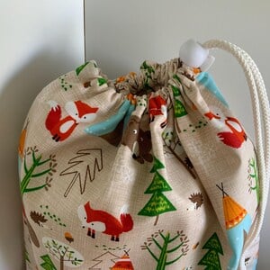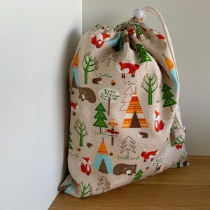 Drawstring wash bag, toiletry bag. Cotton exterior with nylon waterproof lining and fitted with a toggle to hold the bag closed.