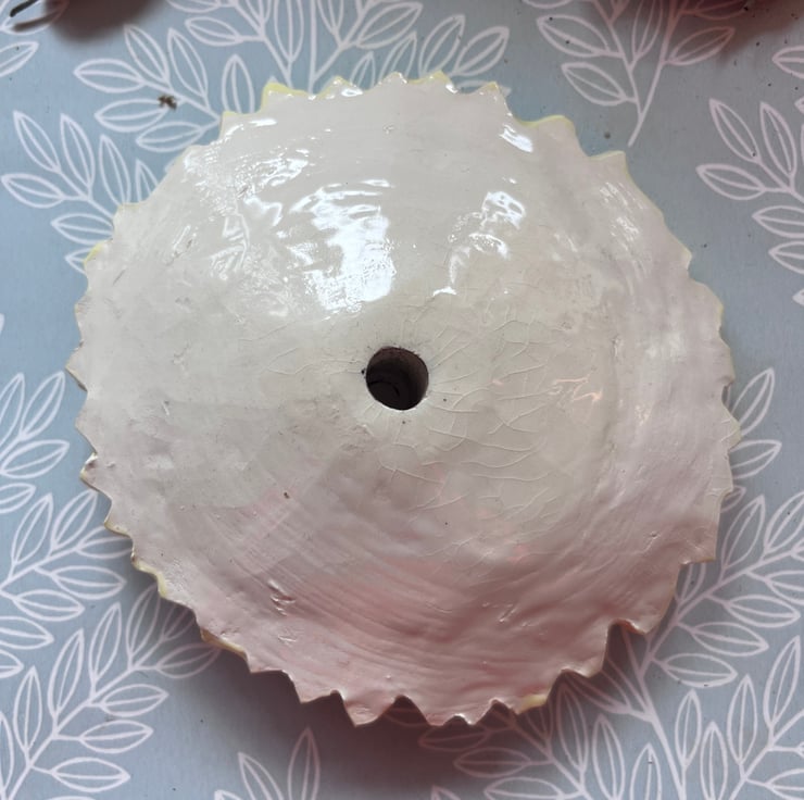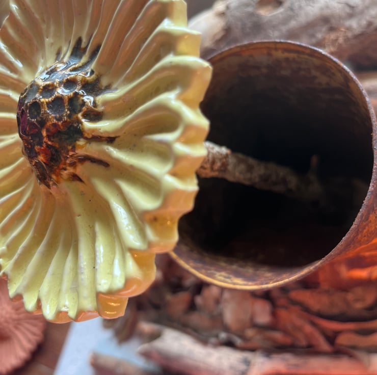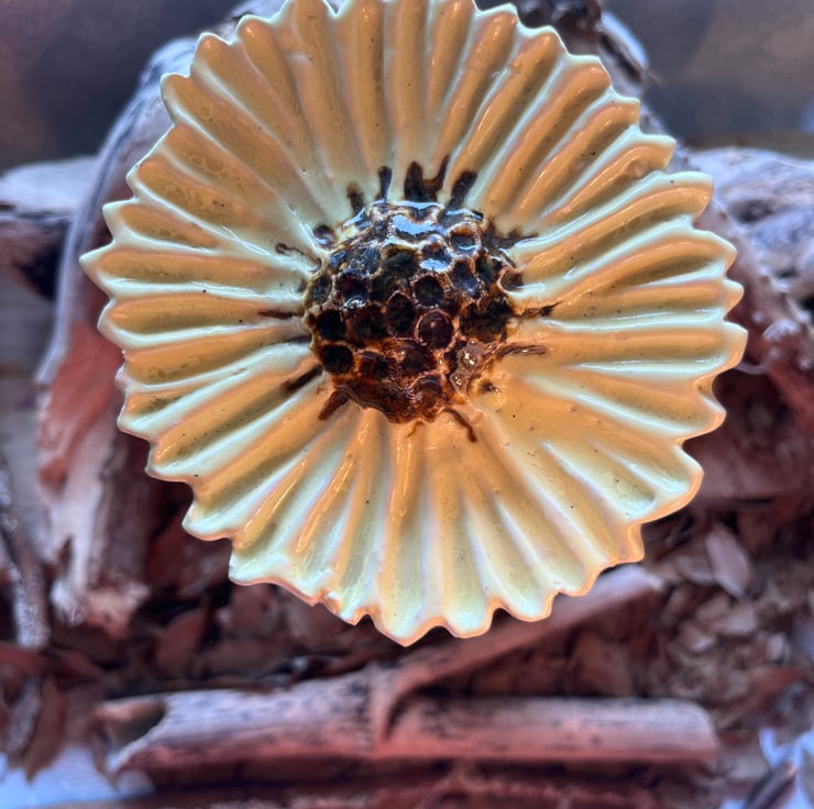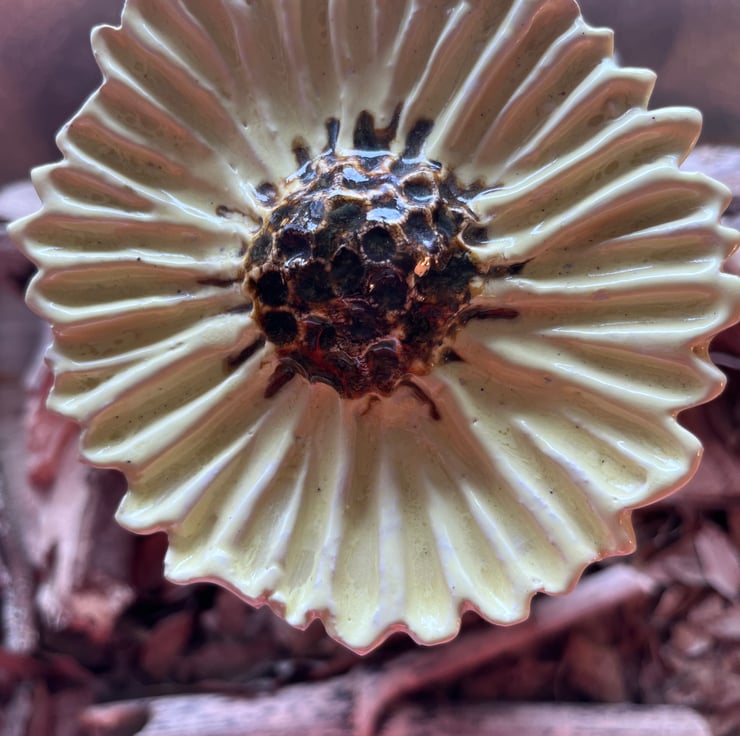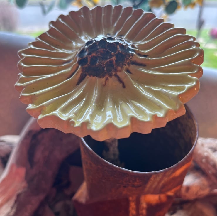 Ceramic sunflower cane topper fired at 1060c With a 8/9mm hole for a cane (not supplied)…looks good inside with other plants/flowers and outside in the garden but please remember it’s not frost proof…thank you for looking…JK10