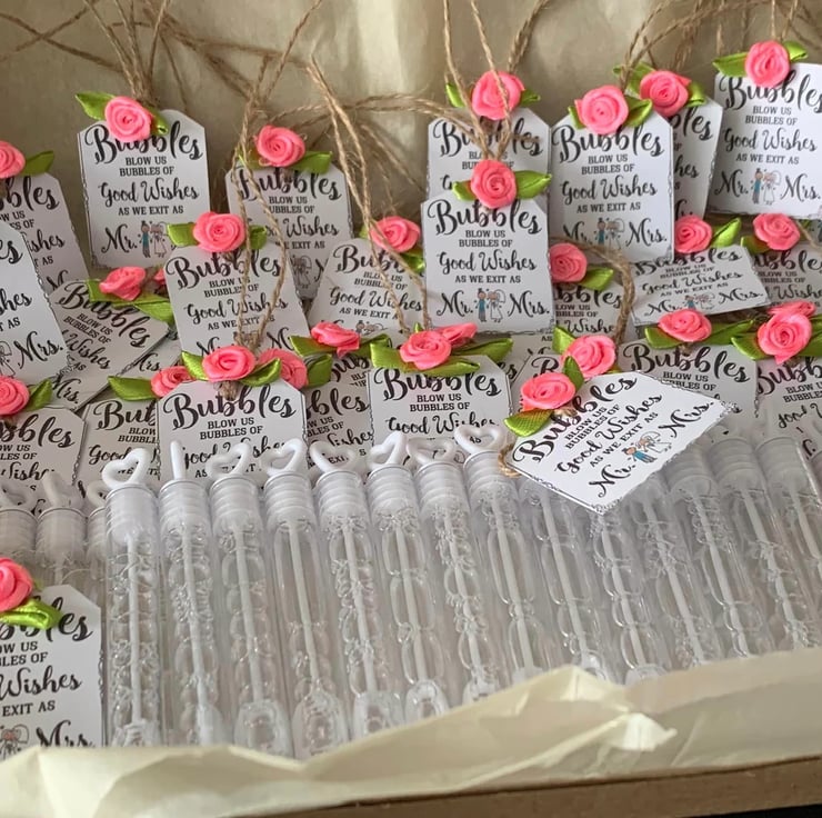 Handmade card signs made by myself and bows attached to the cards with jute string and bubble wand bubbles Please realise that the personlisation is for the colour of the ribbon (ONLY) I Can only print the Mr & Mrs Tag only in the picture.