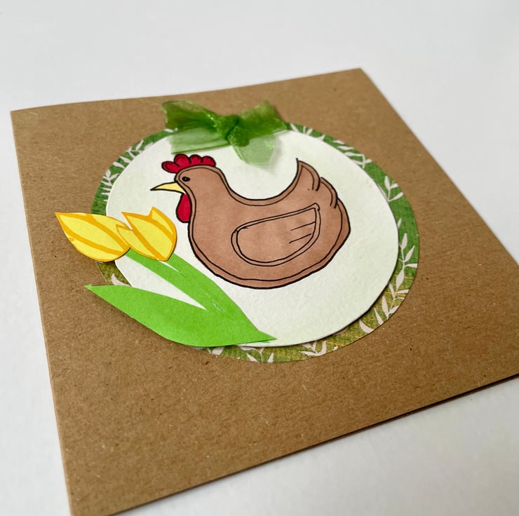 Each card is individually handmade. They feature a chicken: drawn and cut from card, painted and mounted onto a circle of contrasting card, then finished with ribbon and flower decorations. This is in turn added to a natural recycled card blank. Each card is slightly different. This card features a yellow tulip design on a green background