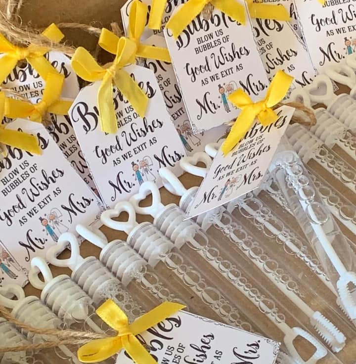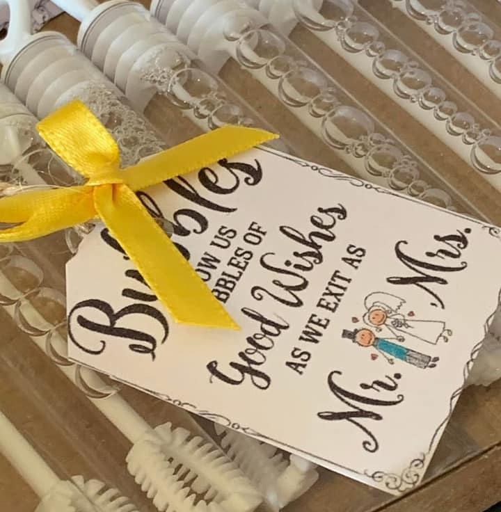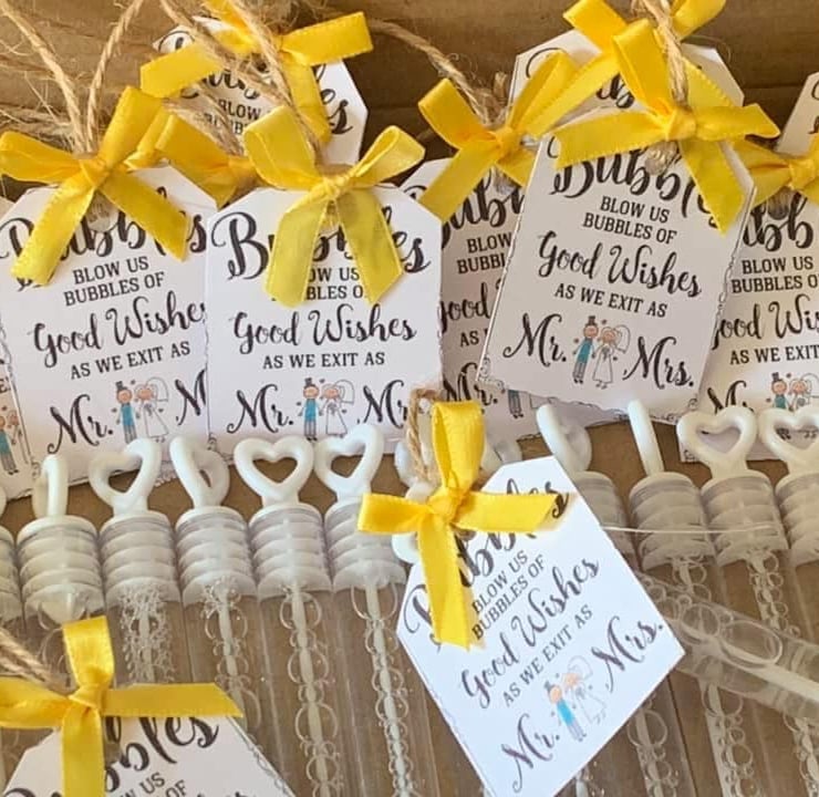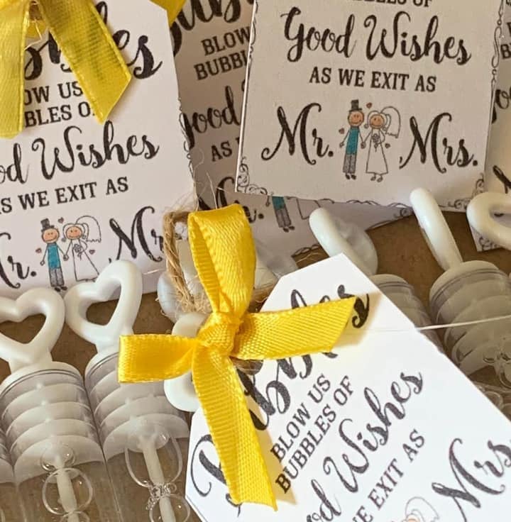 Handmade card signs made by myself and bows attached to the cards with jute string and bubble wand bubbles Please realise that the personlisation is for the colour of the ribbon (ONLY) I Can only print the Mr & Mrs Tag only in the picture.