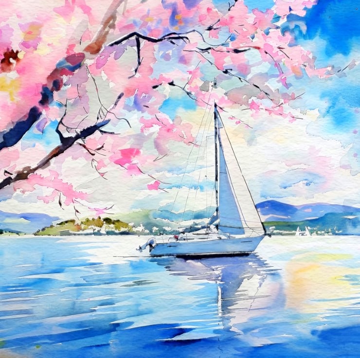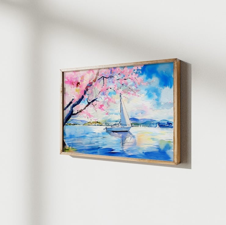 This stunning Sailboat Serenity watercolor painting brings a sense of calm and relaxation. In this tranquil composition, a graceful sailboat glides across a serene lake, framed by delicate cherry blossoms in full bloom. Meanwhile, gentle ripples in the water reflect the bright sky, thereby enhancing the dreamy atmosphere.