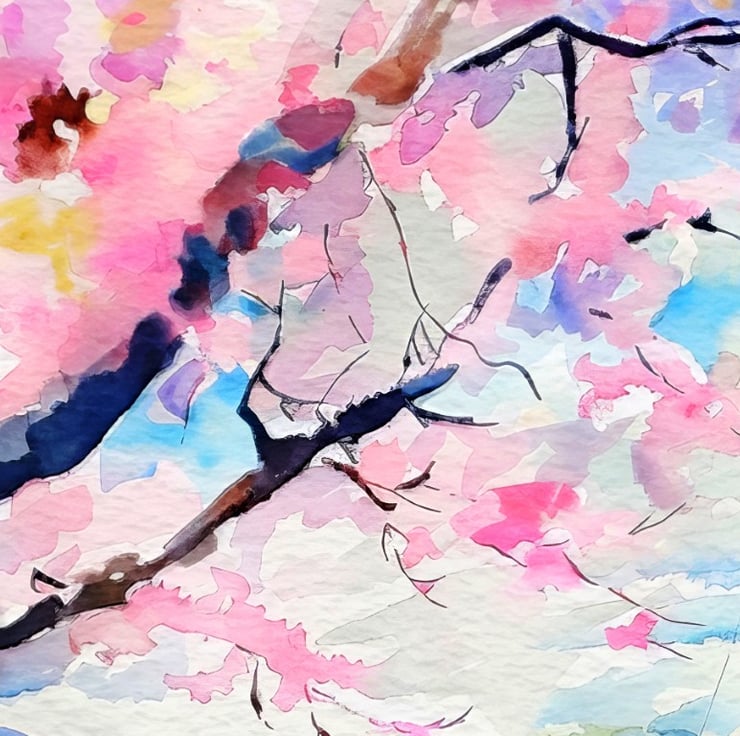 Furthermore, the artist’s soft brushwork and fluid color transitions create a peaceful ambiance, inviting viewers to immerse themselves in the scene. At the same time, the vibrant blues of the lake and sky contrast beautifully with the pink blossoms, making this painting a delightful celebration of nature’s harmony.
