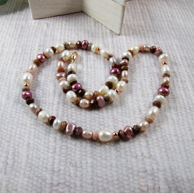 Neutrals Gemstone Necklace. Mixed Pearl and Gemstones 20 inch necklace with rose gold filled beads and rose gold vermeil magnetic clasp.