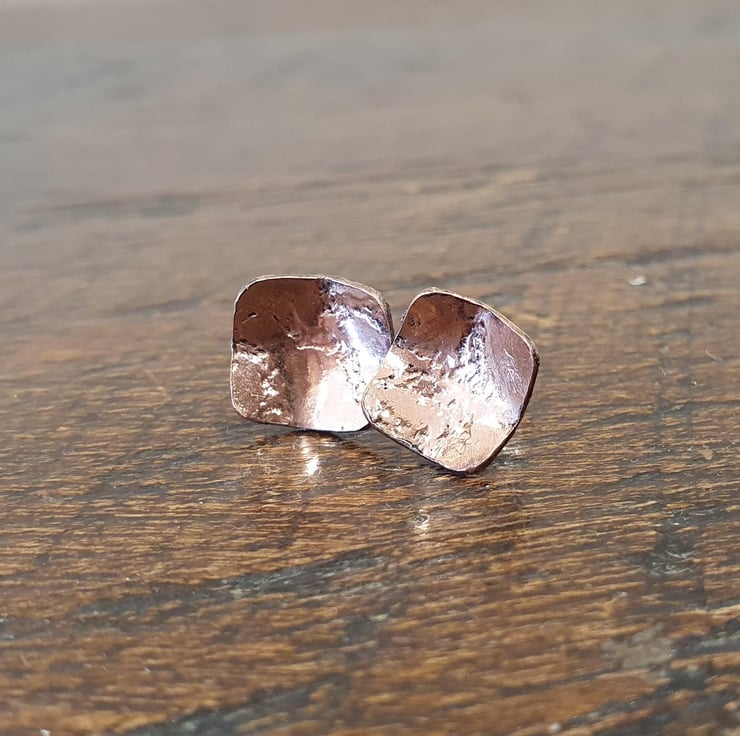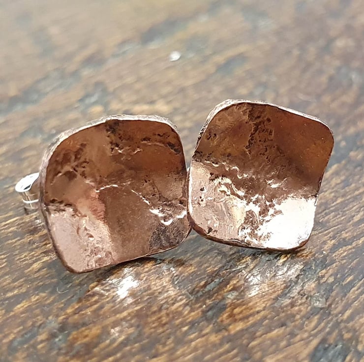 Curved copper earrings, textured using delicate lace through a rolling mill and curved to create natural form. These copper earrings have silver posts and silver butterfly fixings.