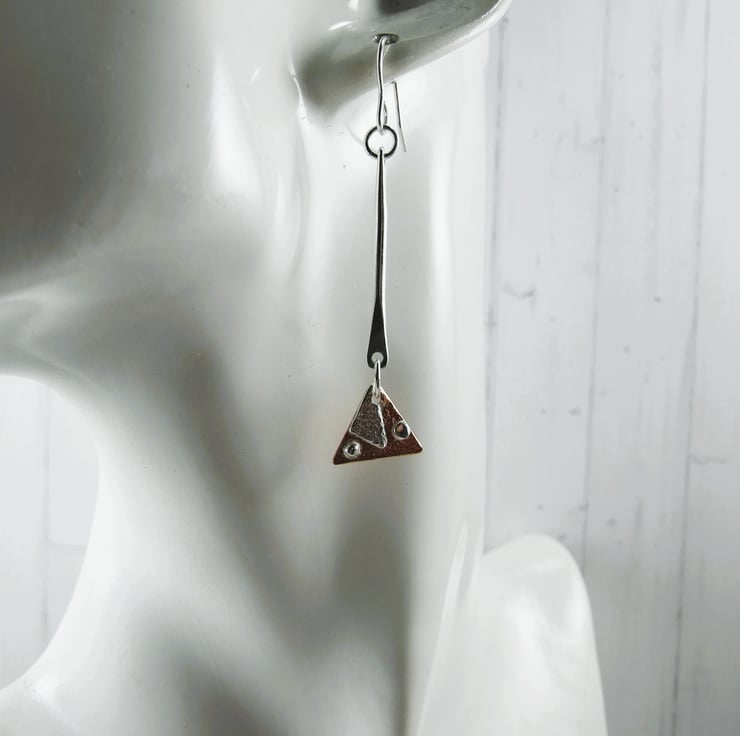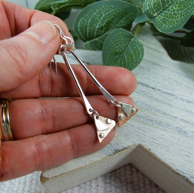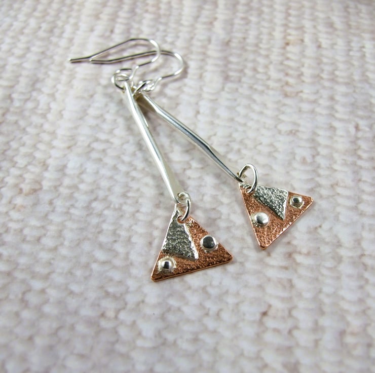 I have created the triangle shapes from copper sheet, hand cut and decorated with sterling silver sheet and beads. The bar is made from sterling silver wire hammered at both ends to flatten and drilled. The triangles are soldered to the bar and then the bar is fitted to sterling silver ear hooks