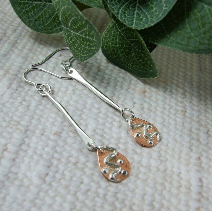 Sterling Silver Bar and Copper Teardrop Earrings.