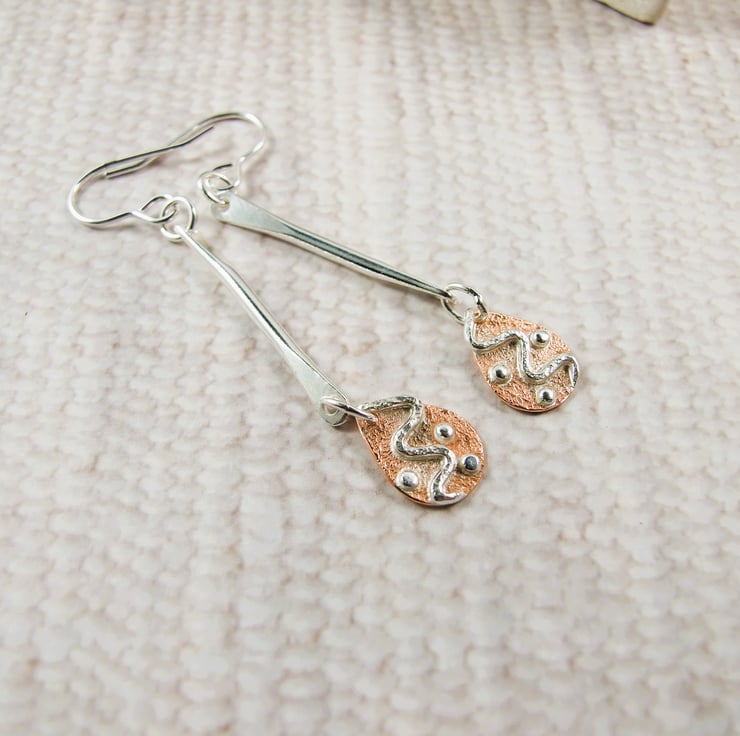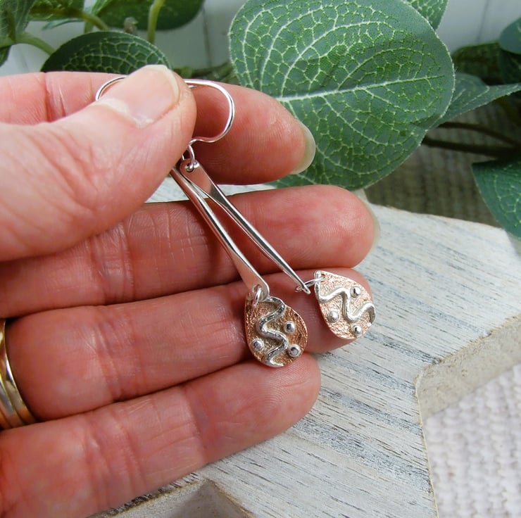 I have created the teardrop shapes from copper sheet, hand cut and decorated with sterling silver wire and beads. The bar is made from sterling silver wire hammered at both ends to flatten and drilled. The triangles are soldered to the bar and then the bar is fitted to sterling silver ear hooks