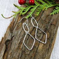 I have created the flower shapes from copper sheet, hand cut and decorated with sterling silver hand rolled wire coils. The bar is made from sterling silver wire hammered at both ends to flatten and drilled. The triangles are soldered to the bar and then the bar is fitted to sterling silver ear hooks