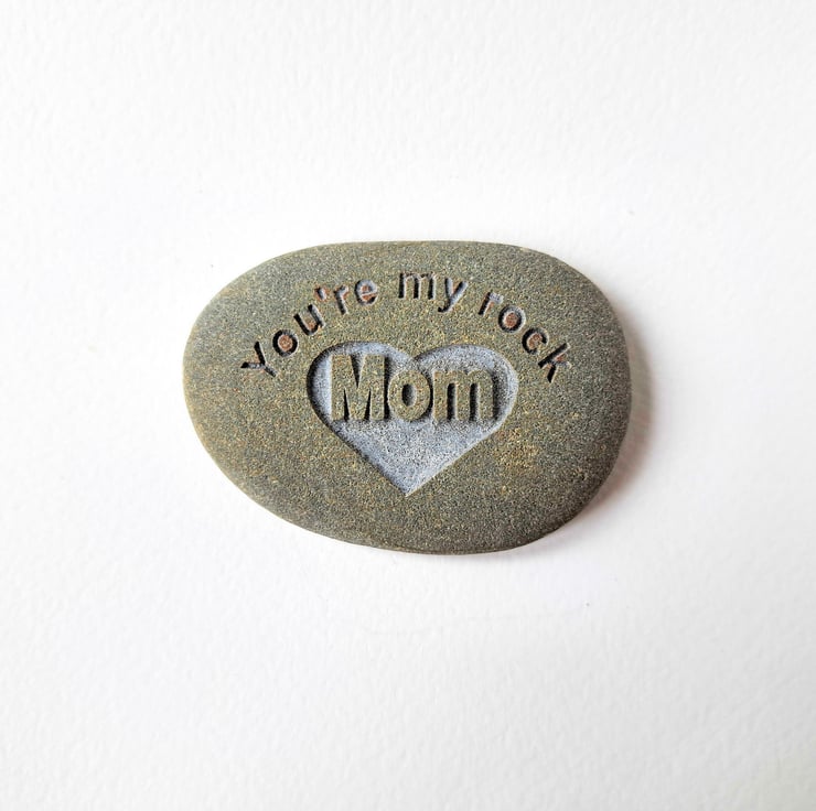 A smooth grey or beige stone, deeply engraved with the phrase 'You're my rock' deep in to the surface, then your choice of 'Dad' Mom', 'Mum' or 'Papa' in a deeply engraved heart shape underneath. This thoughtful gift could be given as a pocket hug and used as a paper weight, book end or an ornament for a desk, window cill or mantelpiece and given for a birthday, wedding anniversary, engagement gift, Christmas present, used as a fitting grave marker memorial stone or just to say 'I love you'...