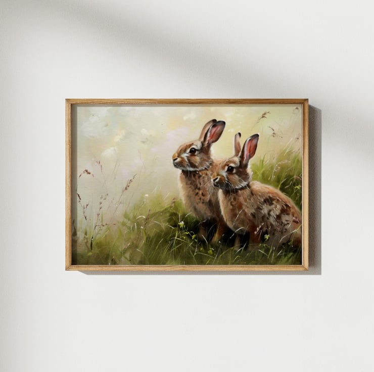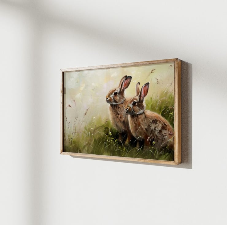Ideal for nature lovers and those who appreciate wildlife art, this Springtime Rabbits painting adds a touch of warmth and serenity to any space. Whether displayed in a living room, bedroom, or study, this piece invites viewers to pause and enjoy the simple beauty of the natural world.