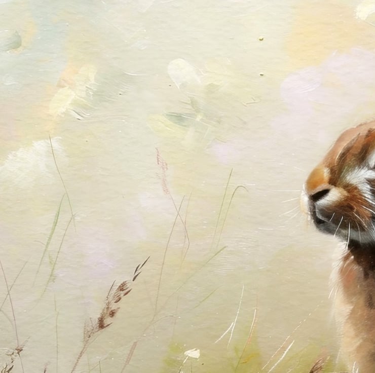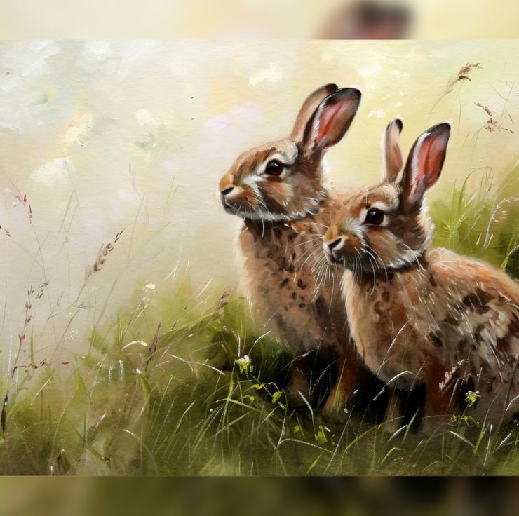 This heartwarming Springtime Rabbits painting captures the essence of nature’s tranquility. In this serene composition, two alert rabbits sit nestled in a field of tall grass, bathed in soft golden light. Meanwhile, their fur is painted with incredible detail, showcasing the texture and warmth of their coats. At the same time, their expressive eyes reflect curiosity and gentleness, thereby making them an enchanting focal point of the piece.