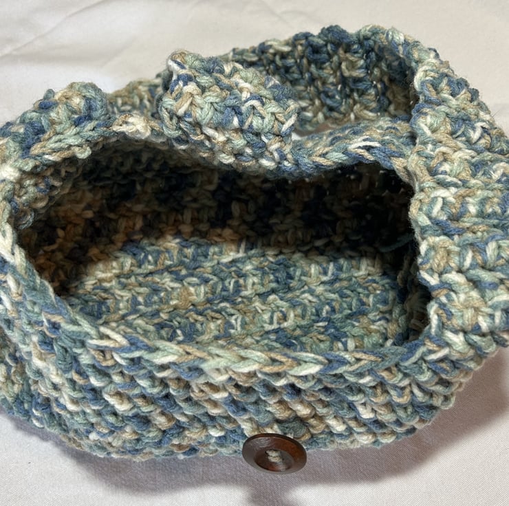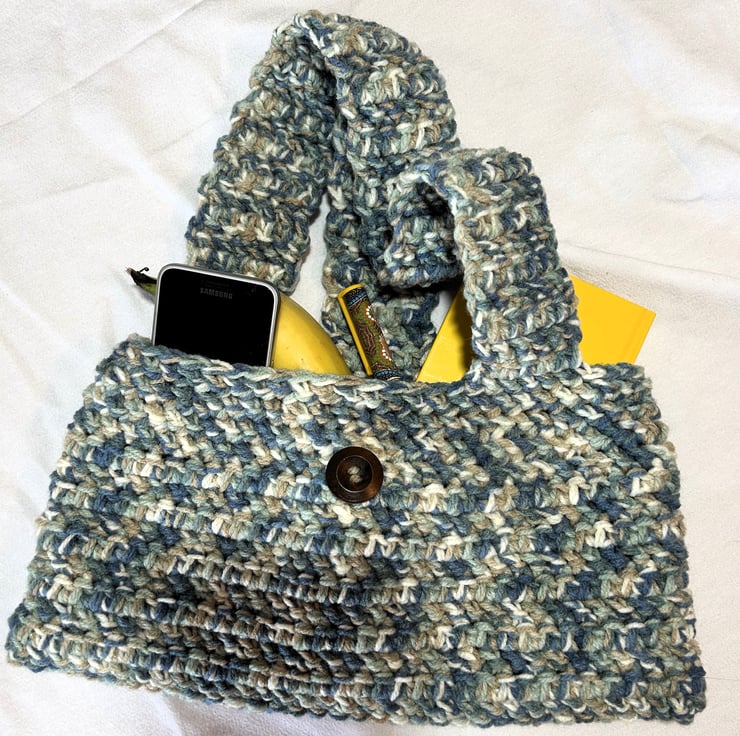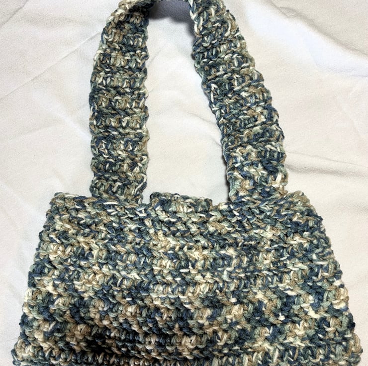 Handmade crocheted shoulder bag. Crafted from 80% acrylic, 20% wool Aran yarn. This stunning sturdy crocheted bag provides all the room you need for an everyday bag. The speckled colour will go with so many outfits.