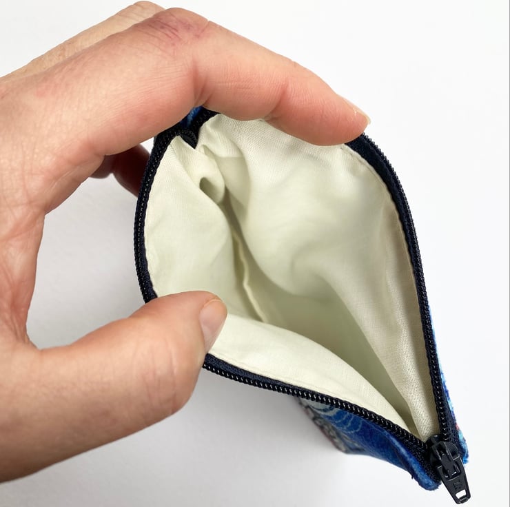 The bag measures 14 x 12 x 0.5cm approx. The zip opening width is 11cm. Cleaning instructions: Hand wash only, and a warm iron on top of a towel or using a pressing cloth.
