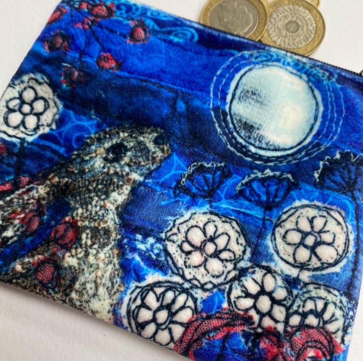 This highly versatile sweet zip bag is decorated with a print of one of my collage designs. This one has a cute little hare gazing at a full moon surrounded by flowers. It’s lined with a cotton lining and has a matching coloured zip. The print is on the front and back.