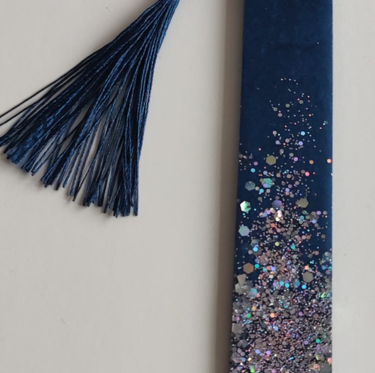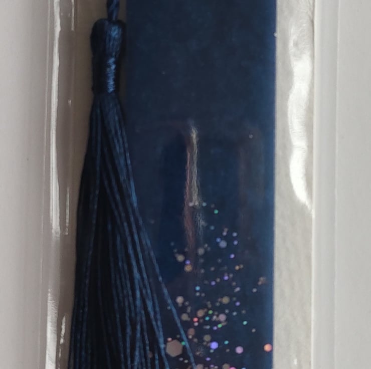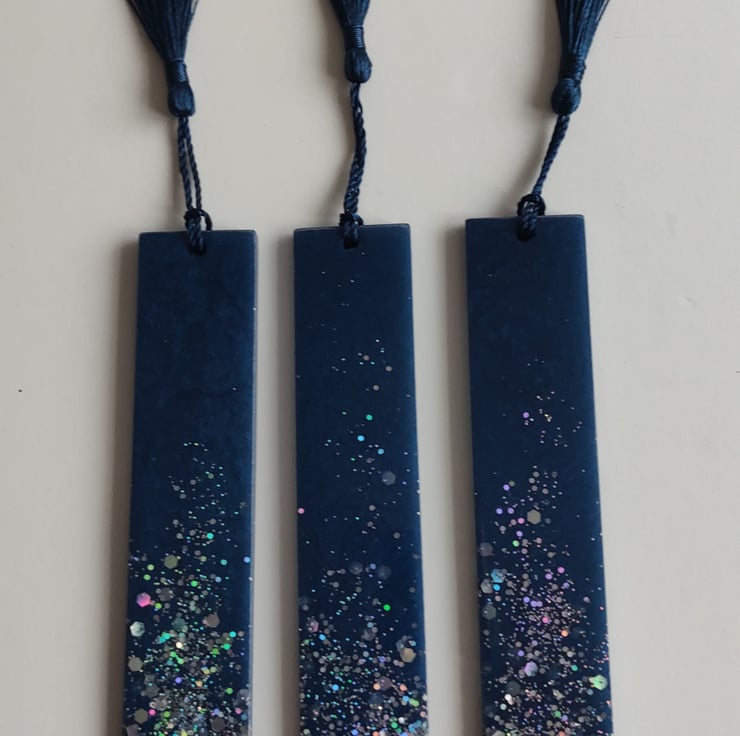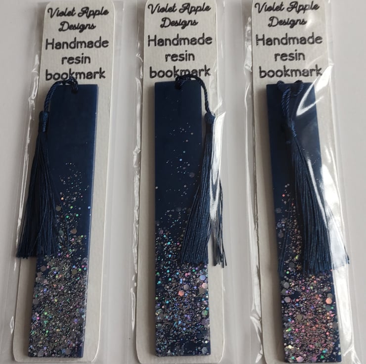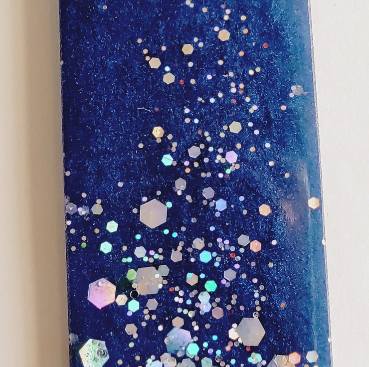 This stunning bookmark made with a rich navy blue resin which has beautiful holographic sparkles which really enhance the deep resin colour.