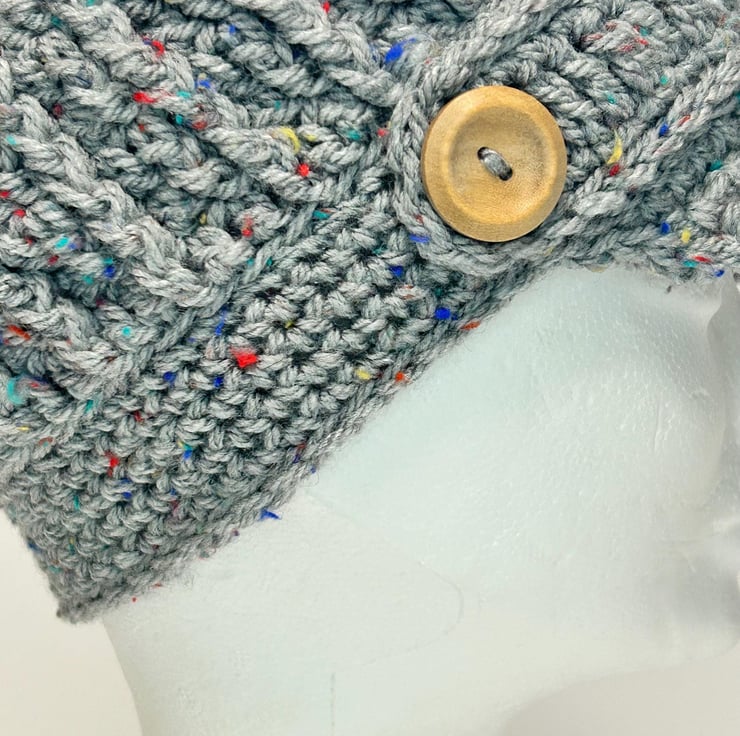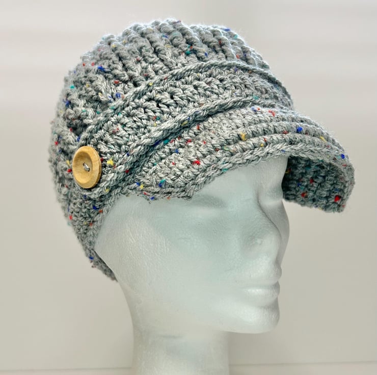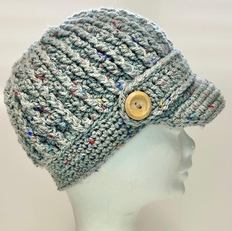 Fabulous tweed fleck light blue grey colour with light wooden shaped buttons to either side of the peak.