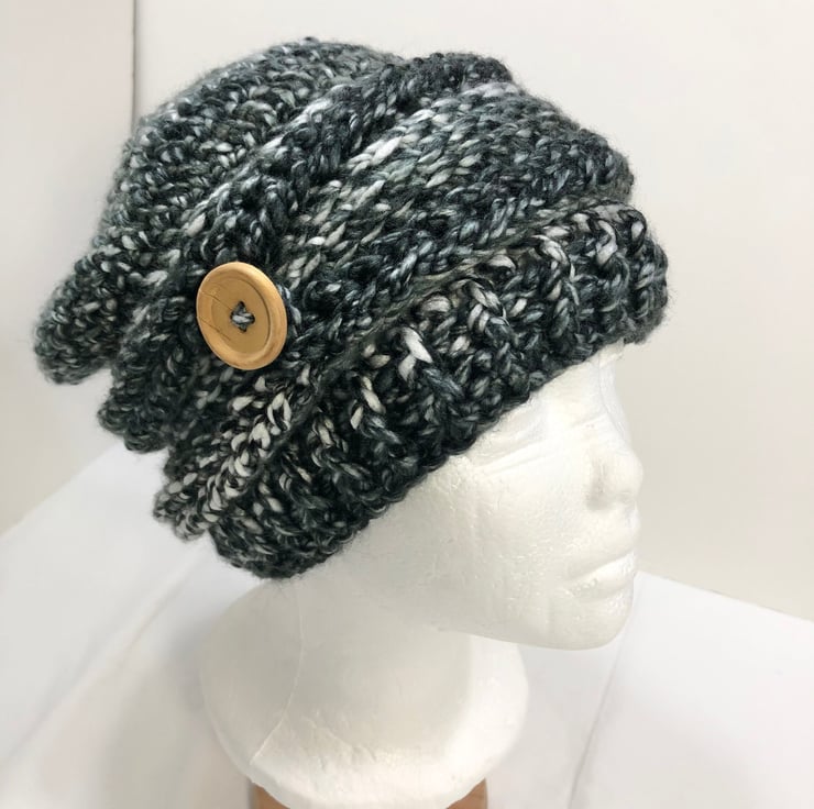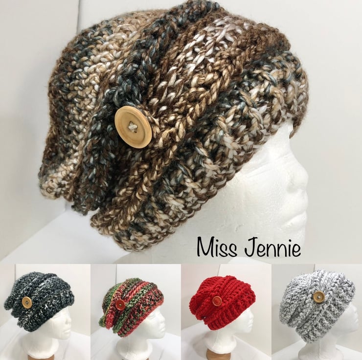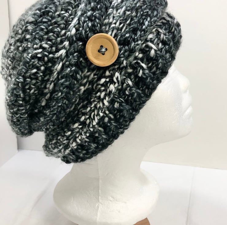 Crochet Slouch Hat with side button detail, perfect for those cold winter days.
