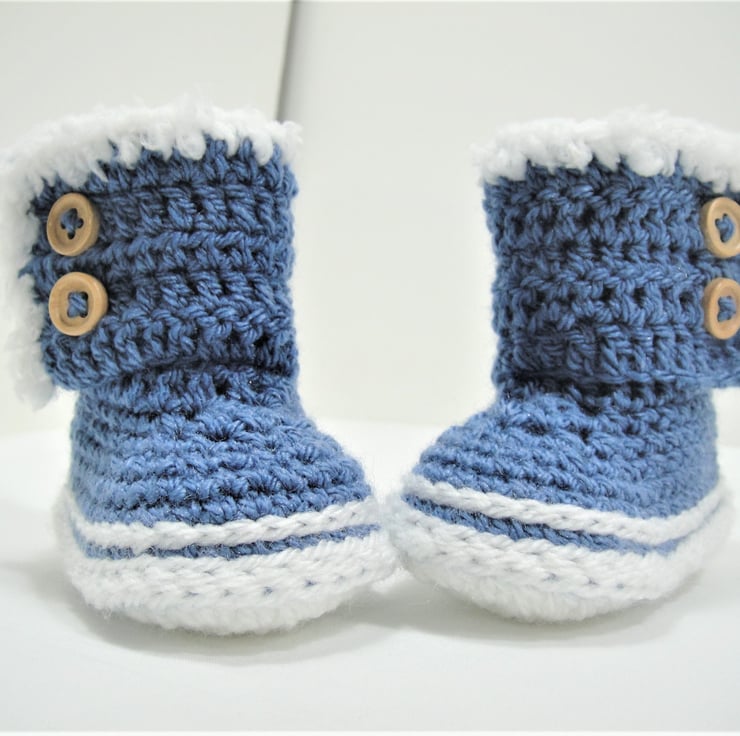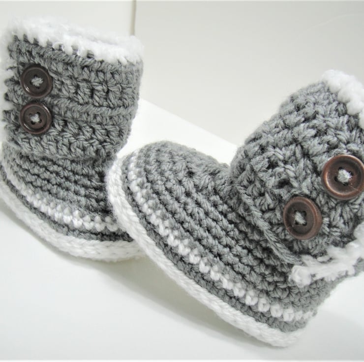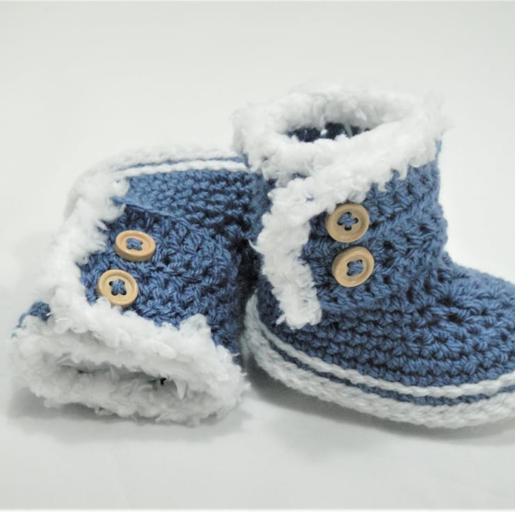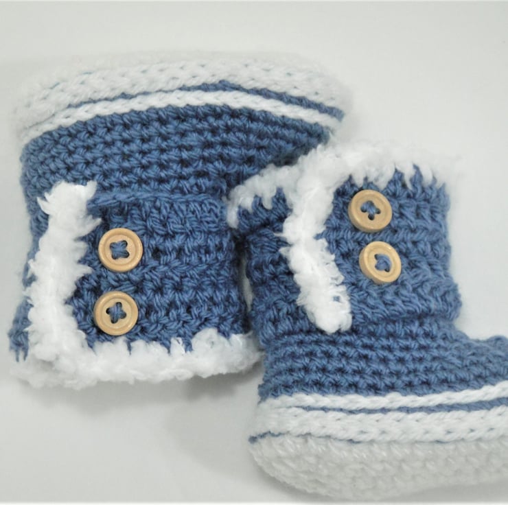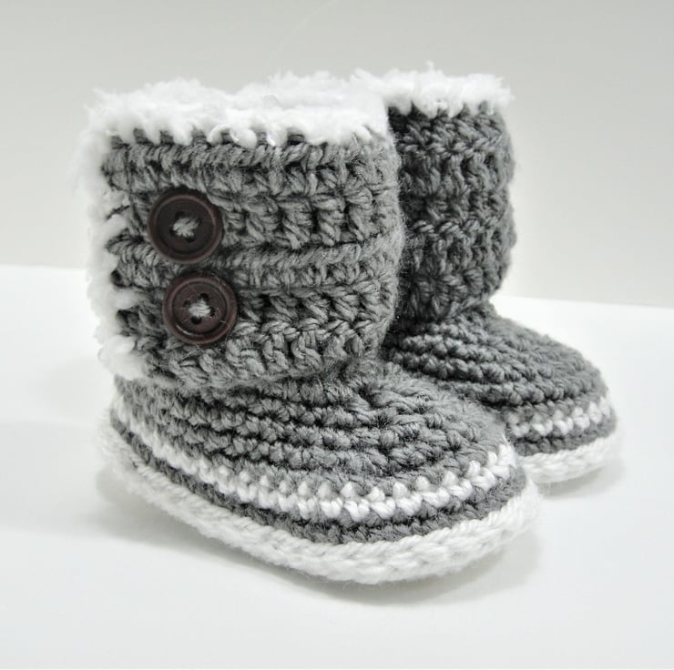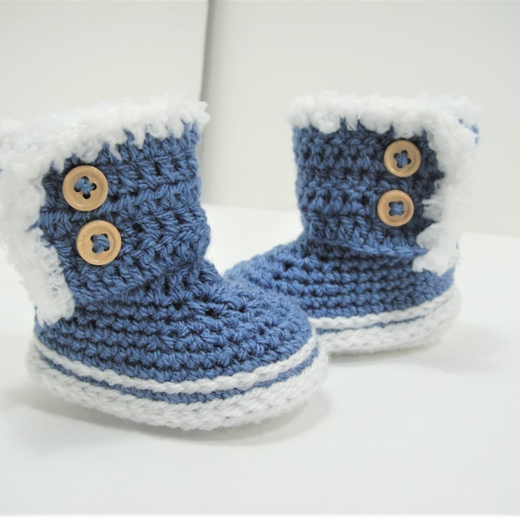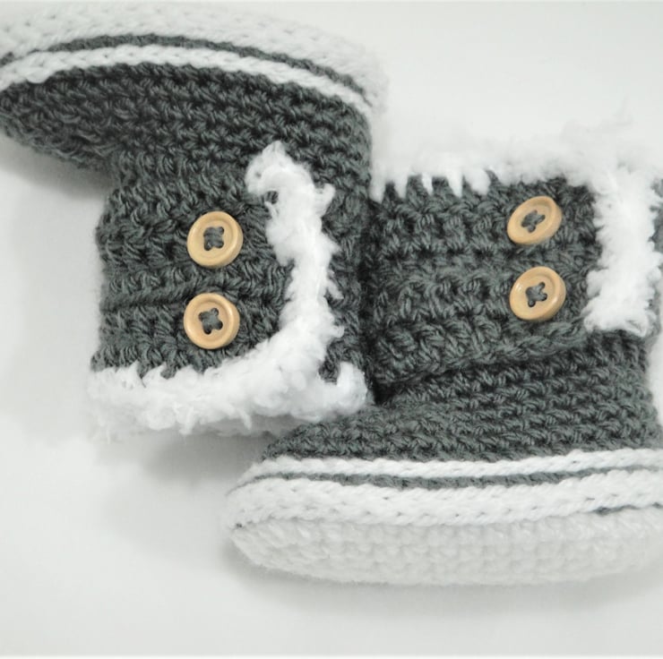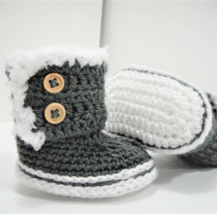 Hand crochet booties shown in photos are Slate grey and Granite grey with a white sole and a soft fleecy white trim & Sailor Blue with soft fleecy white trim.