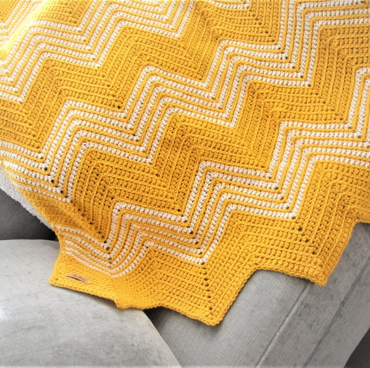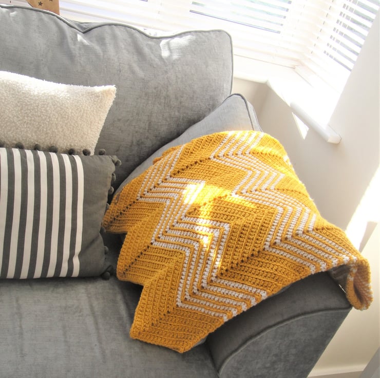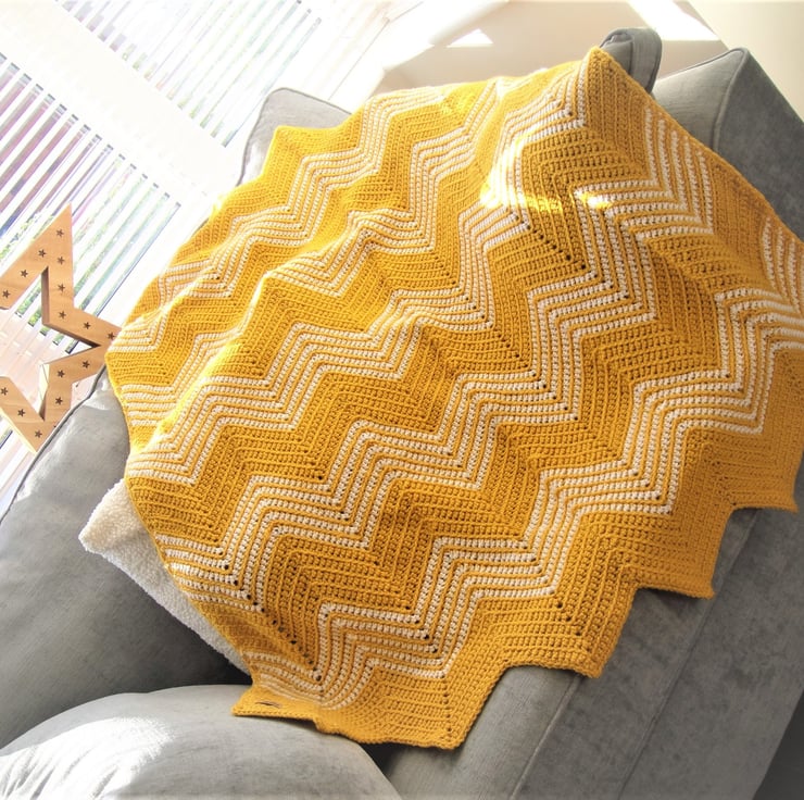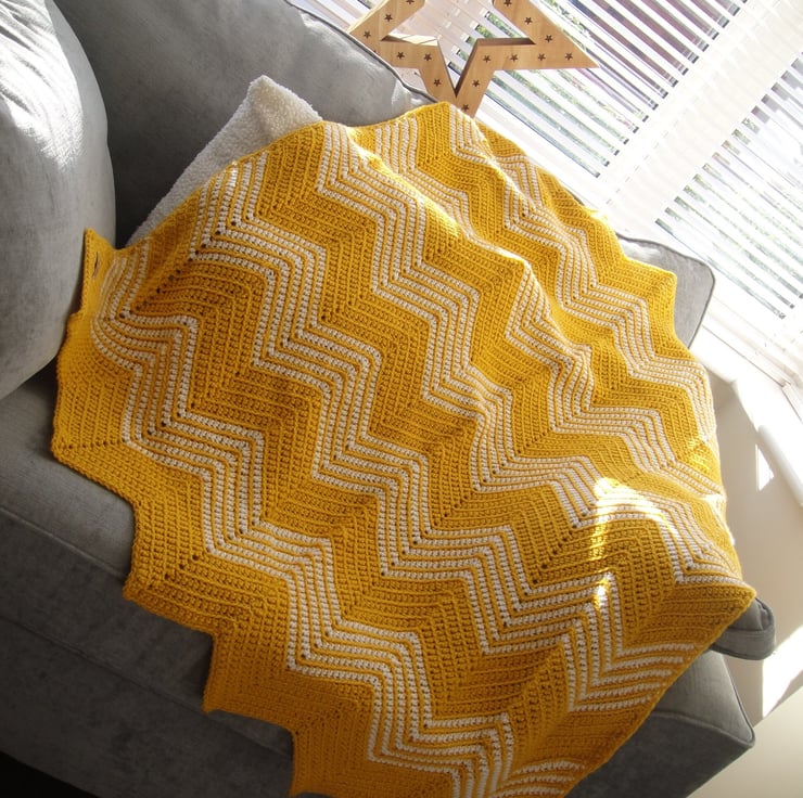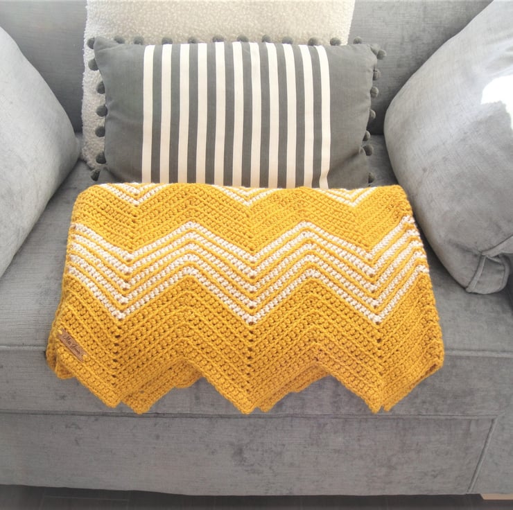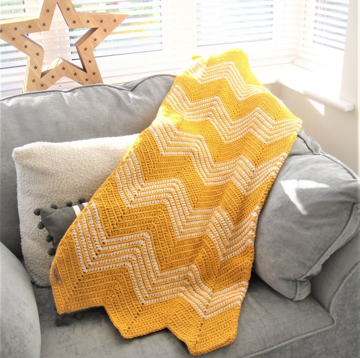 This stunning blanket in Sunny Gold with White accent colour will brighten up your home with it eye catching look!