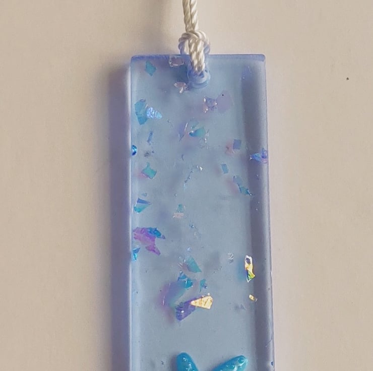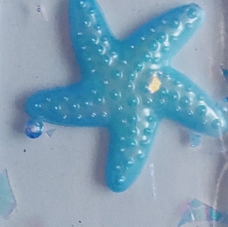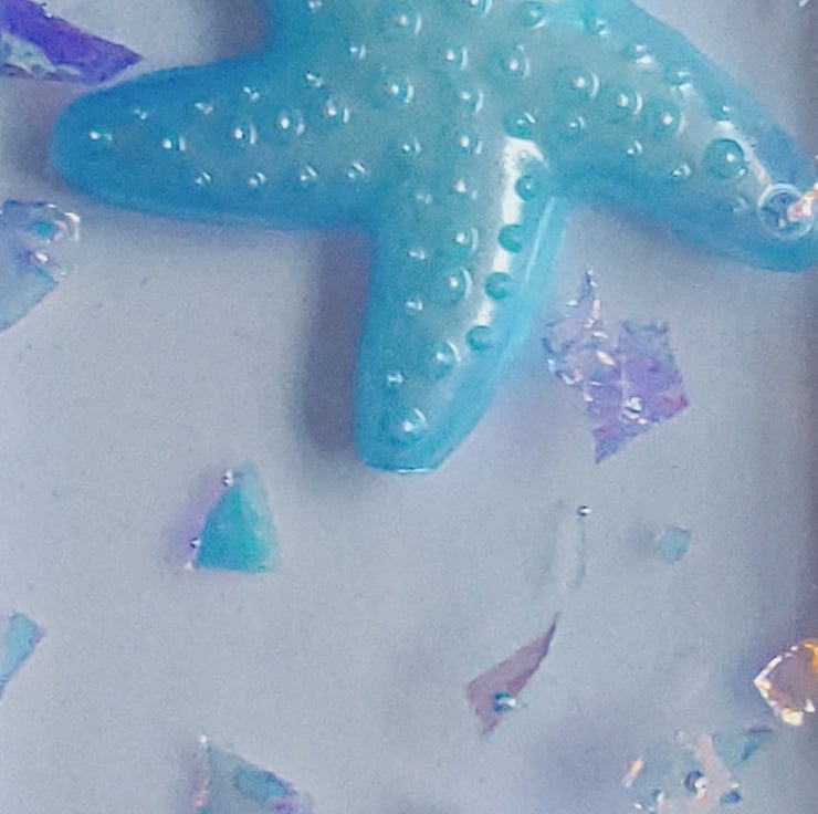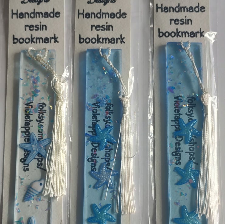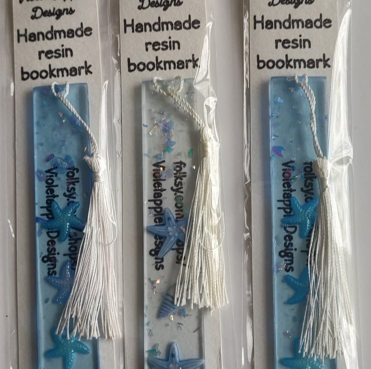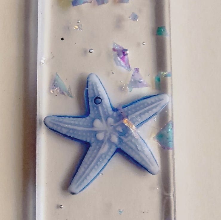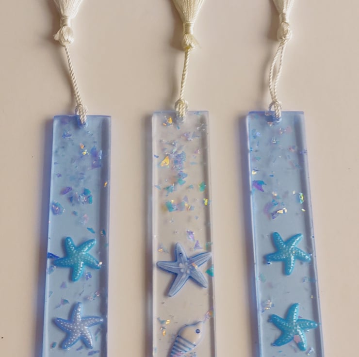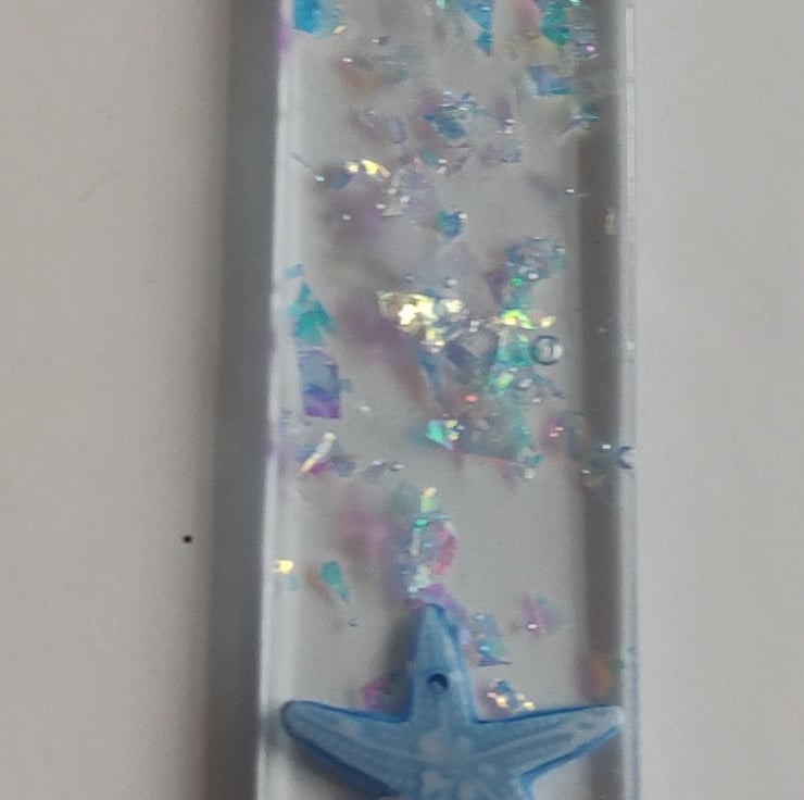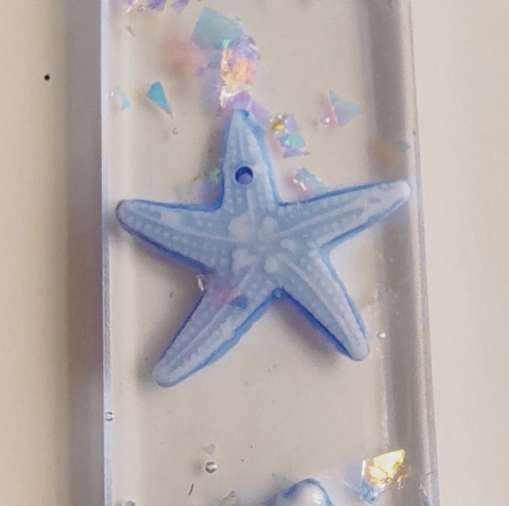 Who doesn't love the seaside? The bookmark is made from very pale blue or clear resin. Inside I have carefully placed beautiful starfish and or shell embellishments in beautiful blue to complement the resin. Some carefully scattered iridescent sprinkles have also been added to give a sense of frothy waves from the ocean.