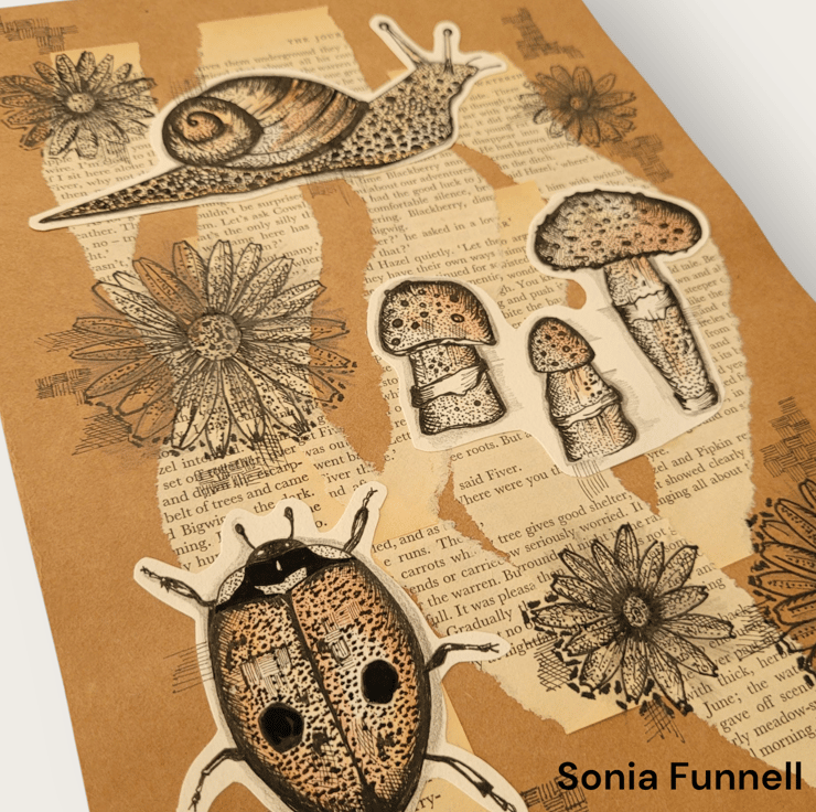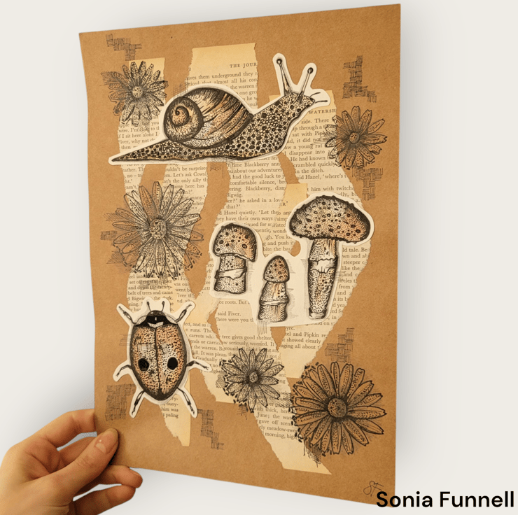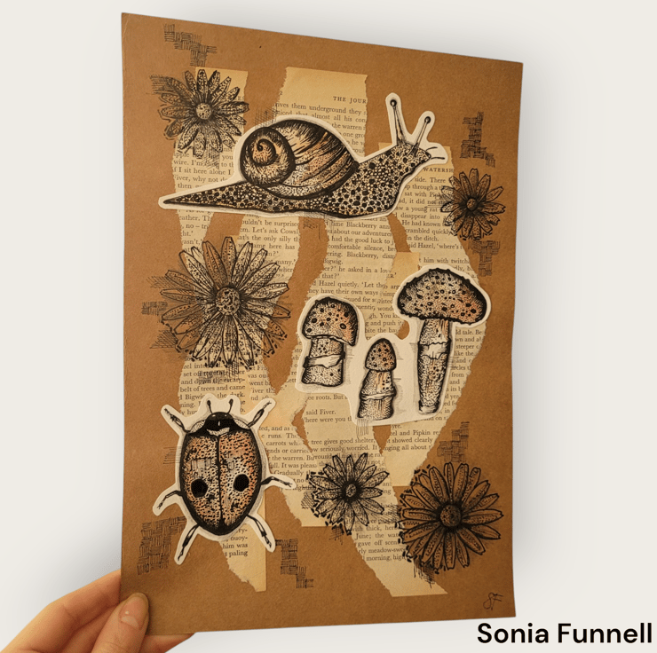 The material used: Range of fine liner pens, colouring pencils, and vintage book papers. Drawn onto A4 brown/white recycled paper. The book used: Vintage penguin copy of Watership Down.