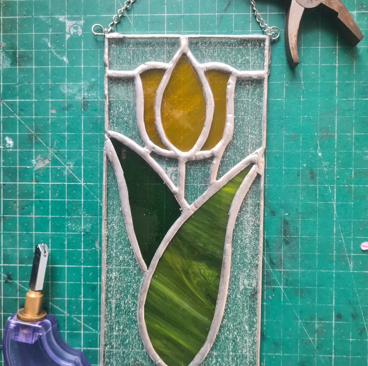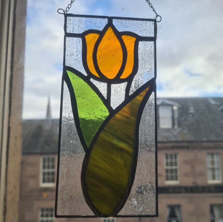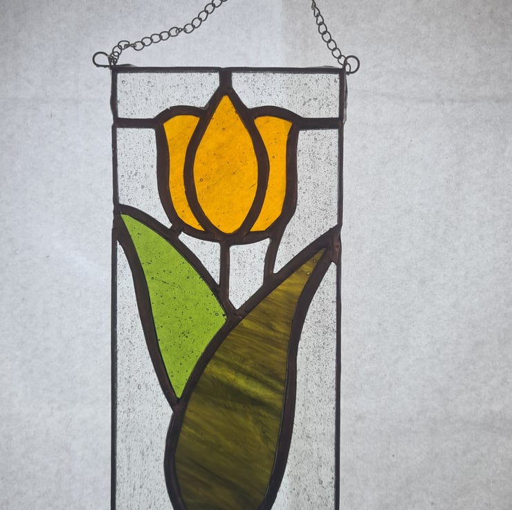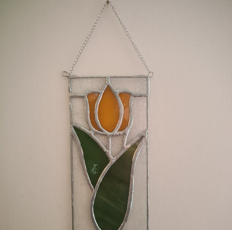This stained glass tulip will bring a touch of spring time into your home all year round! Hand crafted using the Tiffany method it is delicate to look at but made to last and will enchant you for years to come! Measuring 8x22cm approximately it includes hanging chain and suction cup!