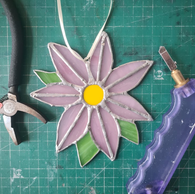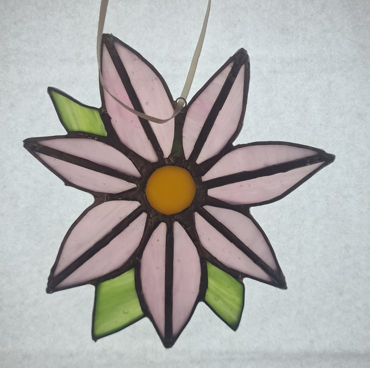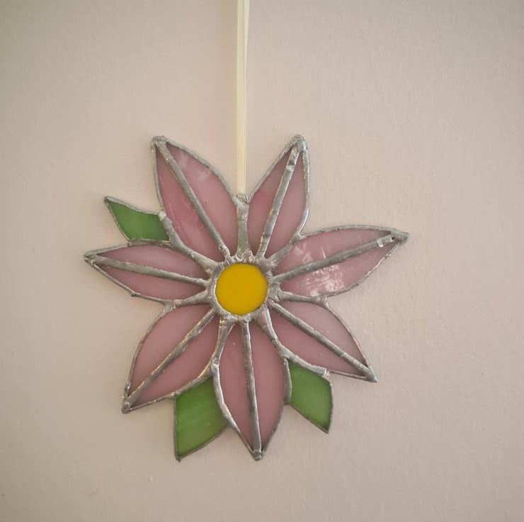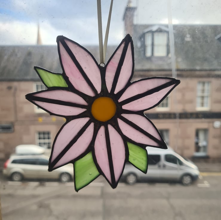 This stained glass pink flower measures approximately 12x14cm. Bring summer vibes indoors all year round with this beautiful suncatcher! Hand crafted using the Tiffany method it is delicate to look at but made to last and will enchant you for years to come!