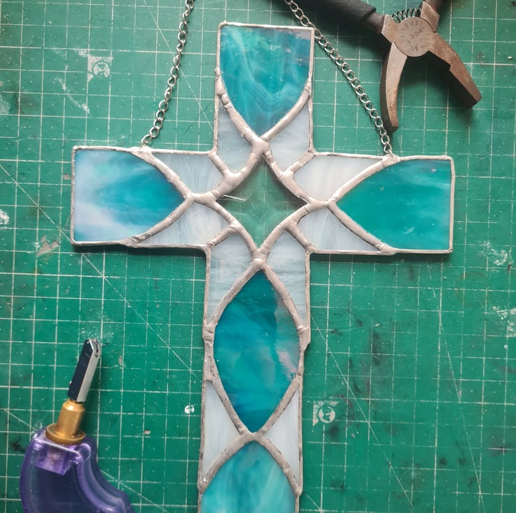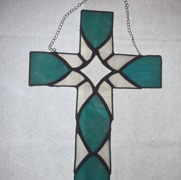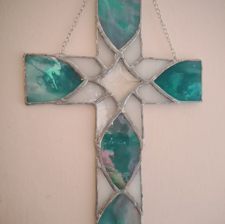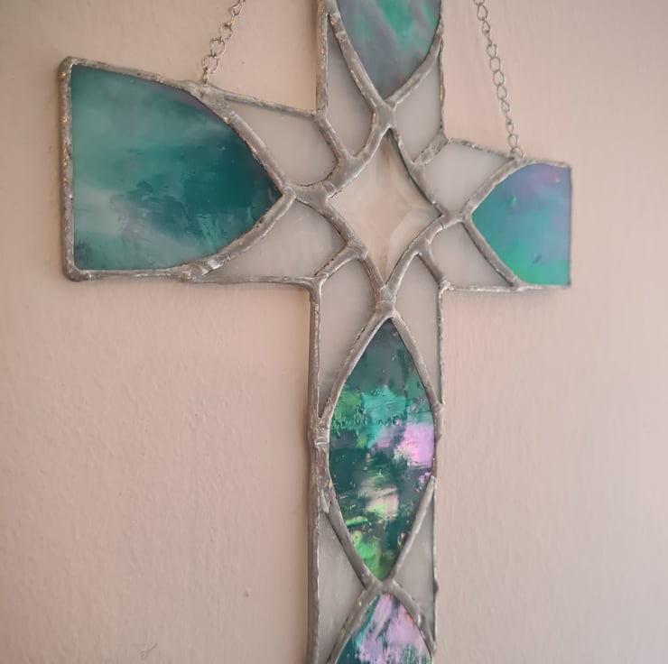 This stained glass cletic cross is made using wispy and iridescent glass with a star bevel that dazzles in the sunshine. Hand crafted using the Tiffany method it is delicate to look at but made to last and will enchant you for years to come! Measuring 16x24cm approximately it includes hanging chain and suction cup. Makes the perfect gift for any occasion