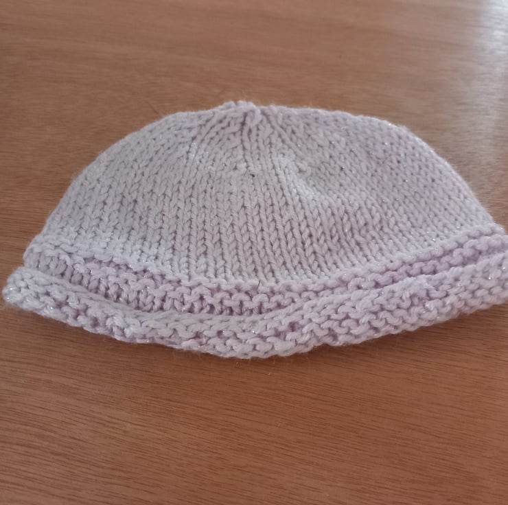 This set is hand knitted in lilac acrylic yarn with a shimner running through it. The hat is a beanie style and measures approximately 14 inches diameter at the widest point