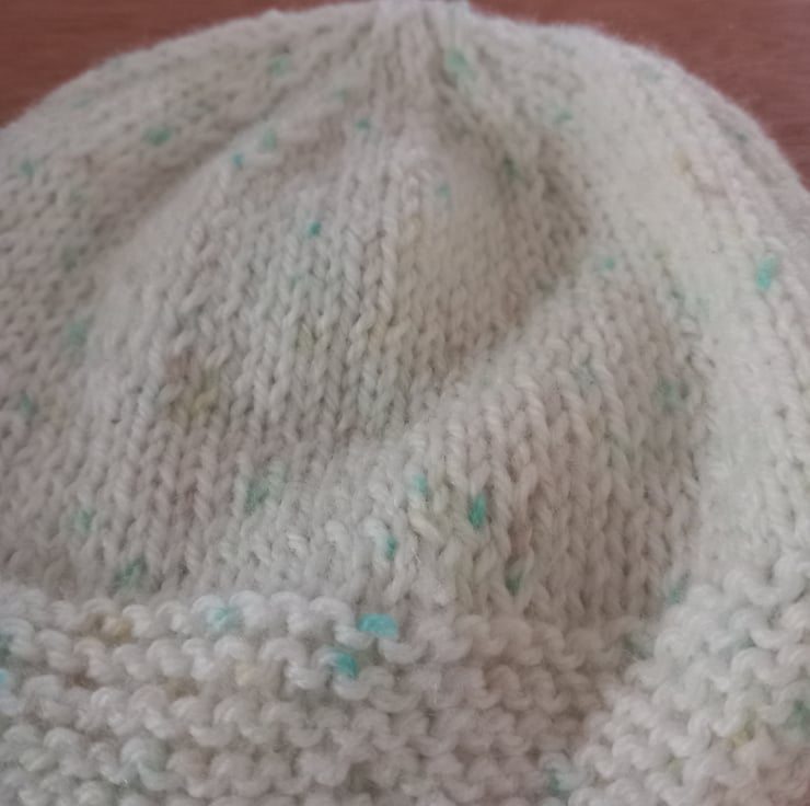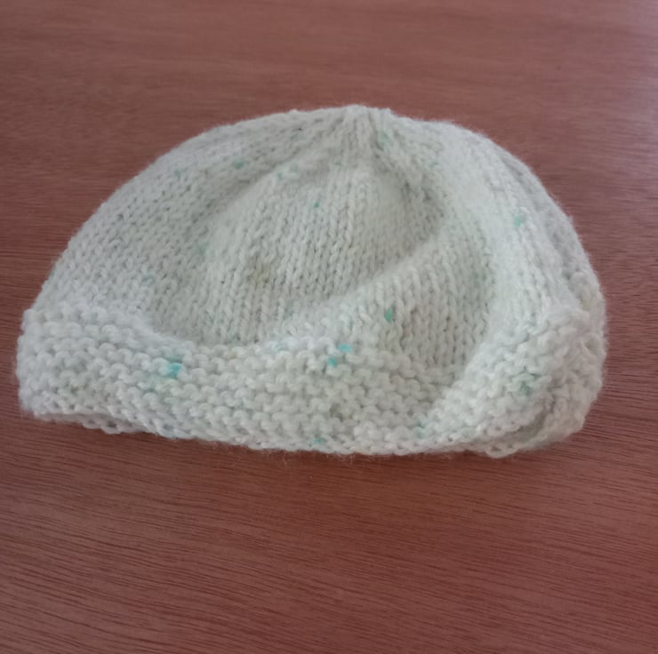 This hat is hand knitted in cream acrylic yarn with a coloured speckles running through it. The hat is a beanie style and measures approximately 12 inches diameter at the widest point