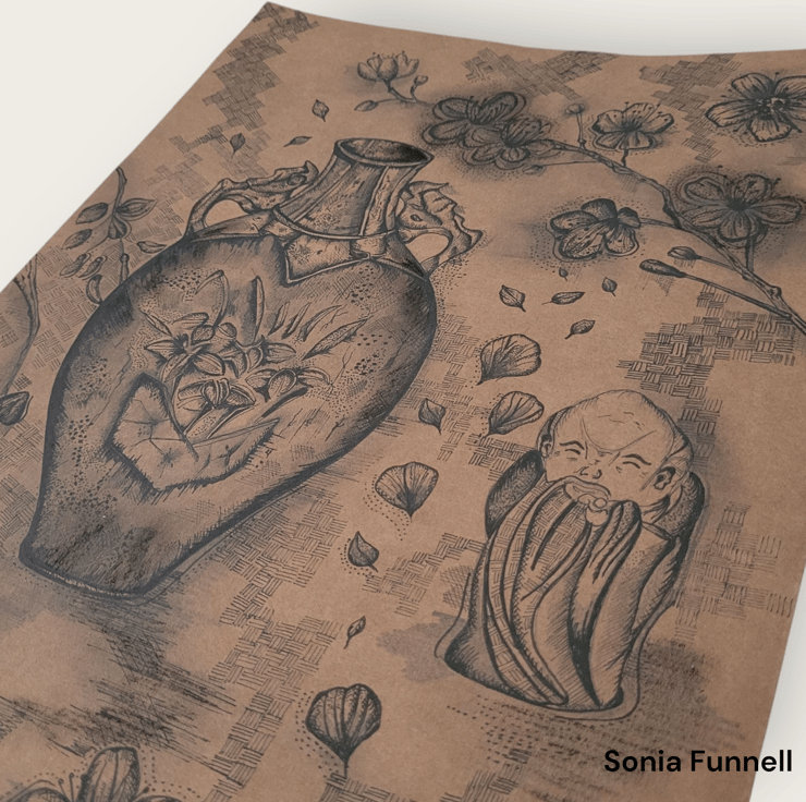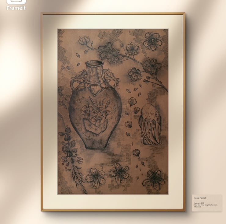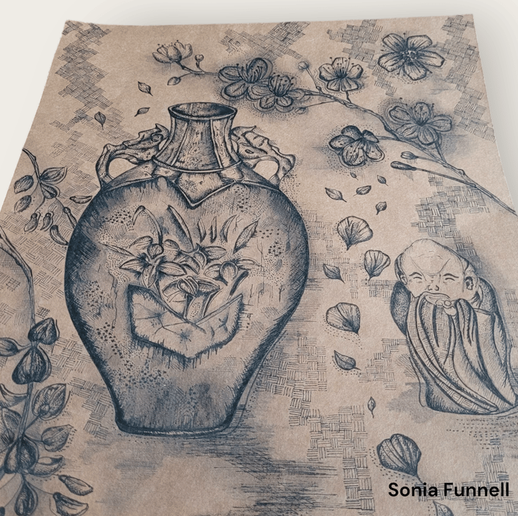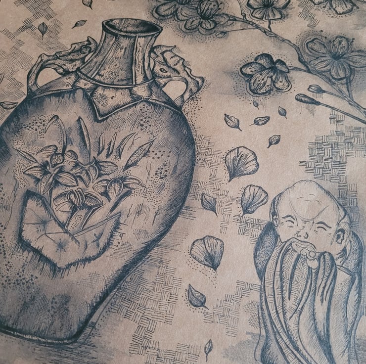 Hand-drawn Japanese Inspired Drawing. This is a still life drawing of vintage japanese ceramics and florals. Specialising in fine liner and pencil drawings to capture the details of nature,culture and animals. This piece comes unframed/unmounted and is sent is protective packaging.