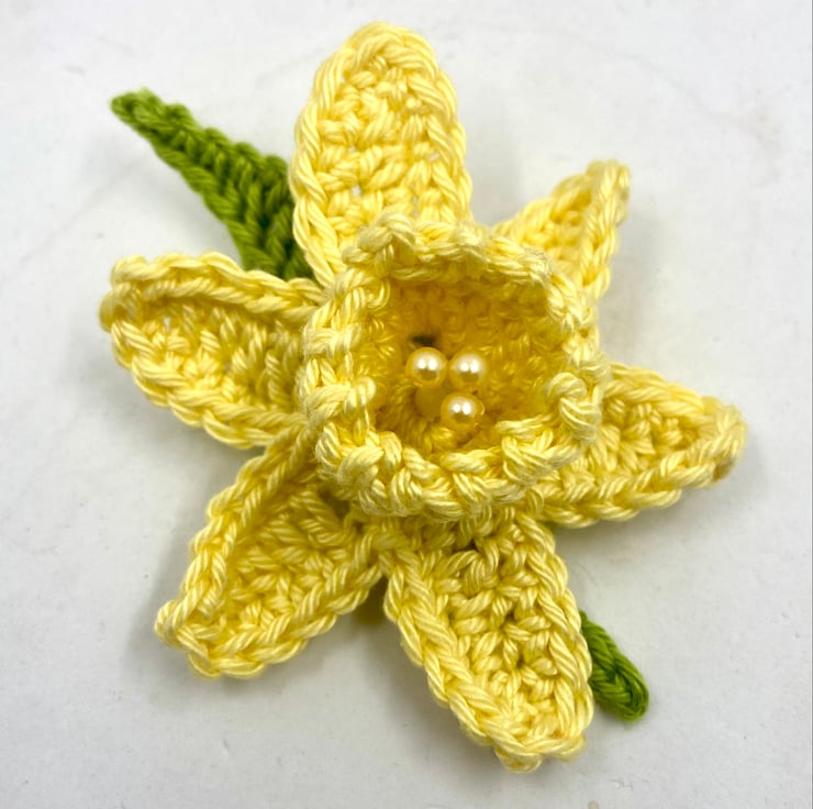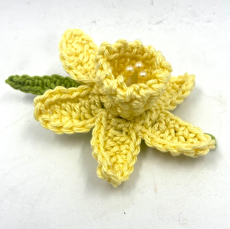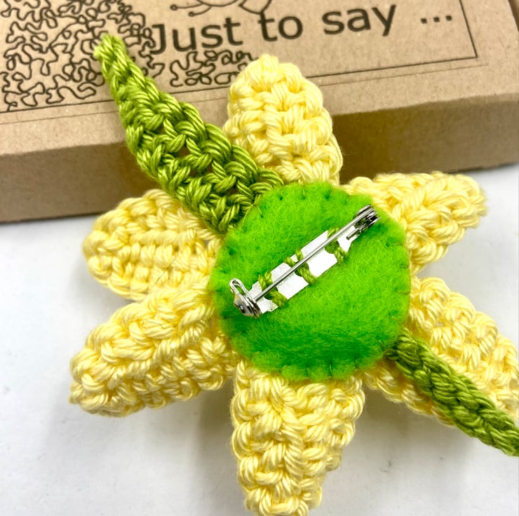 These pretty daffodils are crocheted from a lovely pattern by Lucy at Attic24. I have added a pistil made from a small piece of tubing left behind by our electrician and three faux pearls. The metal finding and leaf are firmly sewn to the back of the brooch on two layers of felt. The flower head measures approximately 8 cm in diameter. The tag the brooch is attached to reads, Happy St David's Day. Each brooch comes nestled in shredded tissue paper in a labelled PIP (Postage in Proportion) box, all ready to be gifted or posted on.