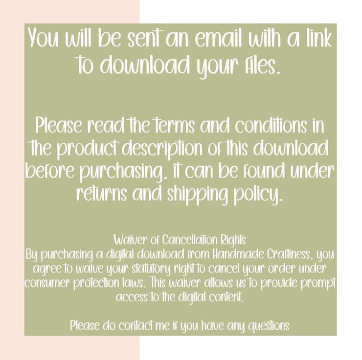 No Refunds for Digital Downloads Refund Policy for Digital Downloads Acceptance of Terms By completing your purchase, you acknowledge and accept this refund policy. At Handmade Craftiness, we are committed to providing high-quality digital products. Please read our refund policy carefully before making a purchase: Waiver of Cancellation Rights By purchasing a digital download from Handmade Craftiness, you agree to waive your statutory right to cancel your order under consumer protection laws. This waiver allows us to provide prompt access to the digital content. No Refunds After Download For digital downloads, consumers are required to waive their cancellation rights before the digital content can be provided. This means that once a customer (i.e., the consumer) has downloaded the content, they have given up their consumer rights to a refund. This policy aligns with consumer law for digital goods, ensuring the protection of intellectual property and preventing unauthorized distribution. Cancelling a Digital Download Under the Consumer Contracts Regulations 2013, digital downloads are neither goods nor services, meaning the law is a little different. If you want to download something within 14 days of buying it (known as the 'cooling-off’ period), you must give your consent to waive the 14-day cooling-off period. If you do not give your consent, the 14-day cooling-off period still applies. However, you will not be able to download your digital content until this period has ended. This policy exists to prevent customers from changing their minds after downloading the content. As you are being sent a link via email to download after purchase this will count as downloading the content as you will have access to download the files from the email. Eligibility for Refunds Refunds may only be issued under exceptional circumstances, such as: The digital content is proven to be defective or incomplete. An error on our part (e.g., duplicate billing). Contact Us If you believe you are eligible for a refund due to one of the exceptional circumstances above, please contact us at orders@handmadecraftiness.co.uk with your order details, a description of the issue, and proof of purchase. Our team will review your request and respond within 7 business days. For further inquiries, please contact us at orders@handmadecraftiness.co.uk. ------------------------------------------------------------------------------------------------------------------------------------------------------------- Ownership and Usage: All artwork within this shop is the exclusive property of Handmadecraftiness. You are expressly prohibited from reproducing, altering, redistributing, reselling, or claiming ownership of any digital item from this store. However, you are permitted to incorporate products from this store into your own physical handmade items for sale as a hobbyist. TERMS OF USE 1. You may print and use these items in a tangible journal/scrapbook/craft project etc. 2. You MAY NOT sell or share these files. 3. You MAY NOT reproduce/alter/redistribute our designs as a digital or physical item. 4. You MAY NOT sell or manipulate these files for resale purposes. 5. You MAY NOT share these files individually or as kits.