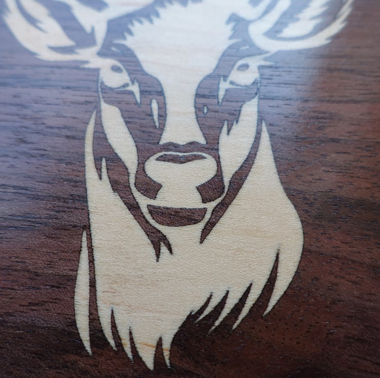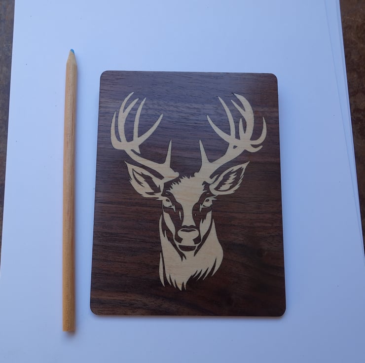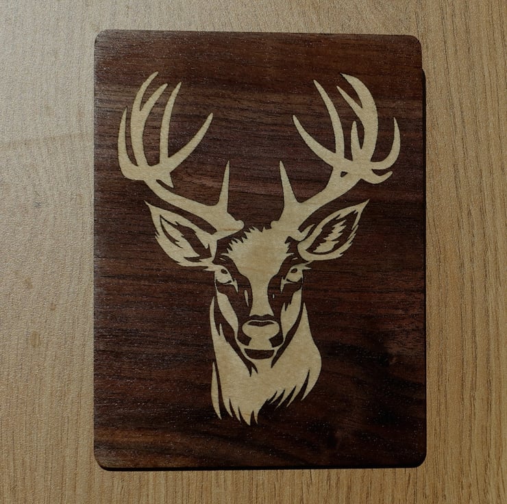 Made with 'upcycled' wood (offcuts from a musical instrument build). This piece of beautifully-figured Walnut is inlayed with a stag's head in Holly. The dark Walnut contrasts with the pale and subtly-figured Holly and brings out the details of the design.