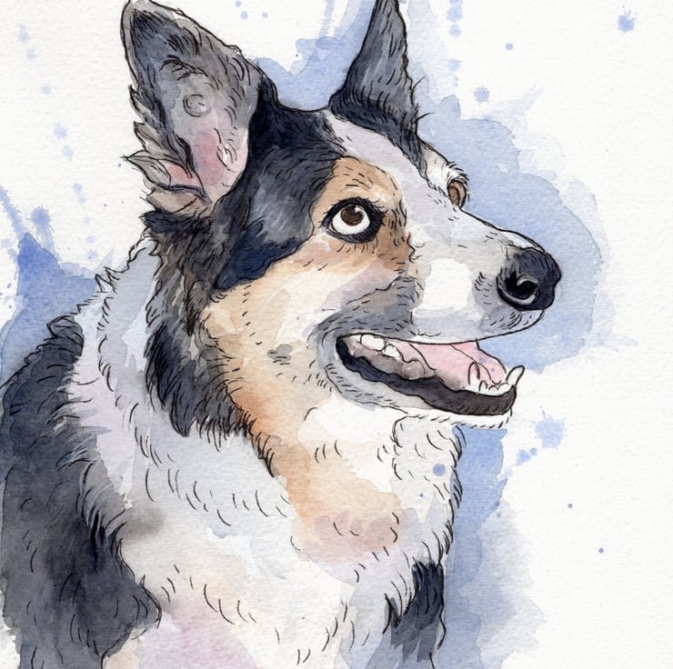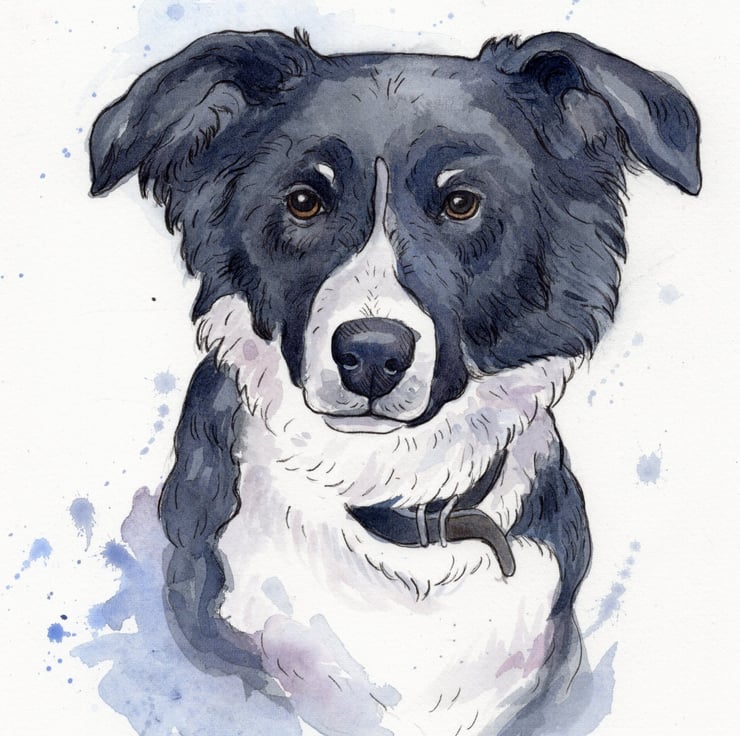This listing is for a multimedia pet portrait, A4 size. Drawn in ink and painted in a loose splashy style with watercolour.