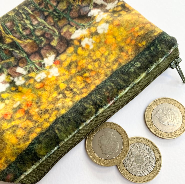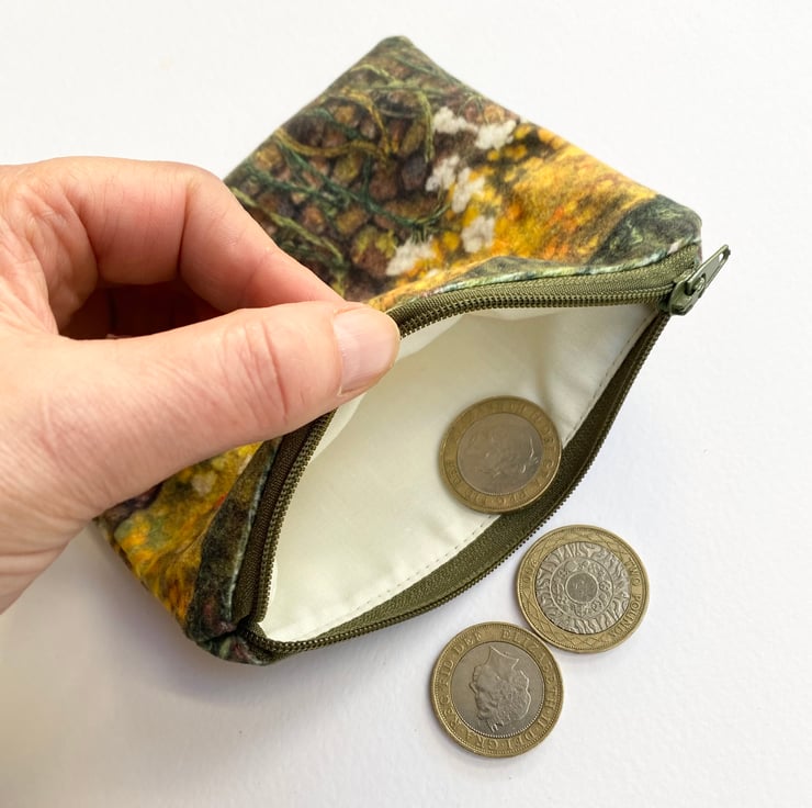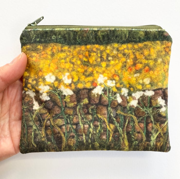 This highly versatile sweet zip bag is decorated with a print of one of my collage designs. This one has meadow seer in front of a dry stone wall with a buttercup field beyond. It’s lined with a cotton lining and has various matching coloured zips. The print is on the front and back.