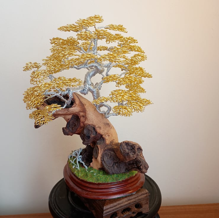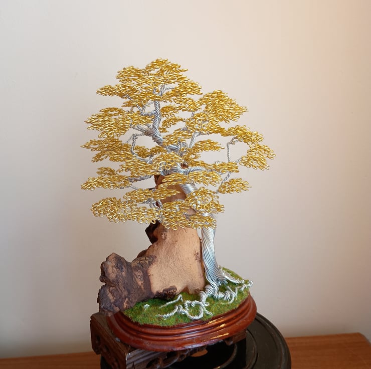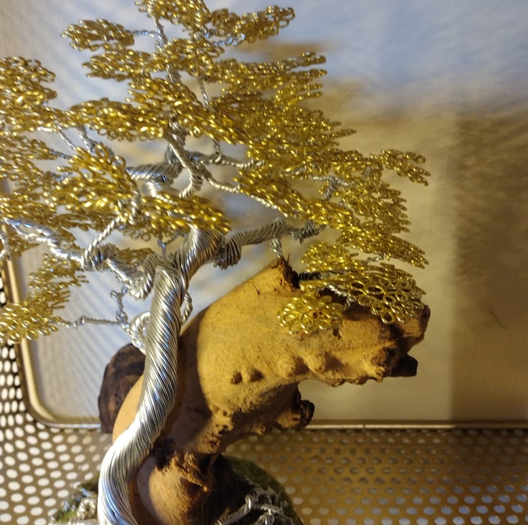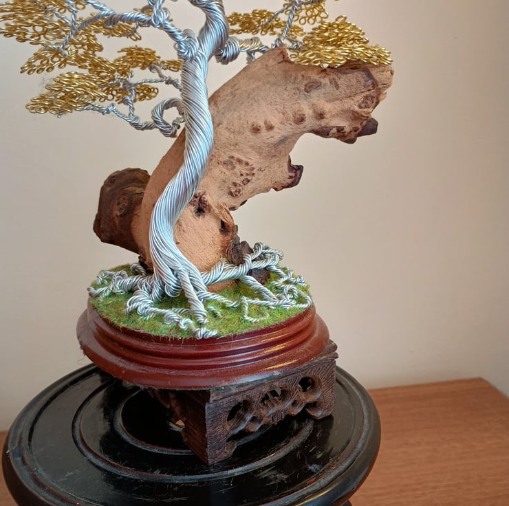 The tree is made of aluminium wire with the trunk and branches made of silver wire and the leaves of light gold, the tree is leaning against a large piece of rosewood which is standing on a wooden plinth with artificial grass around the base for effect , the tree and rosewood stand on an incense burner Oriental stand,made with passion and thought and is the Ideal present for anyone who has a taste of colour as it shows up beautifully when placed next to a light, the tree comes with the stand., the H,9,", the L,6"and the W,5" .