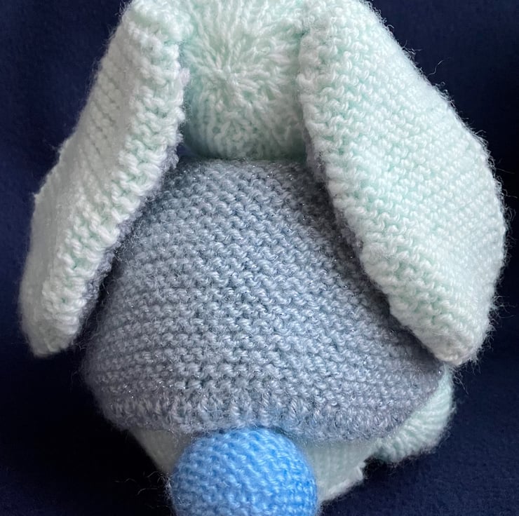 Colours: Rabbit in Green with grey fluffy inner ears, blue nose and tail.