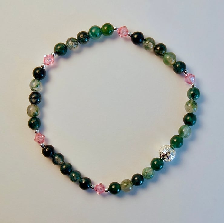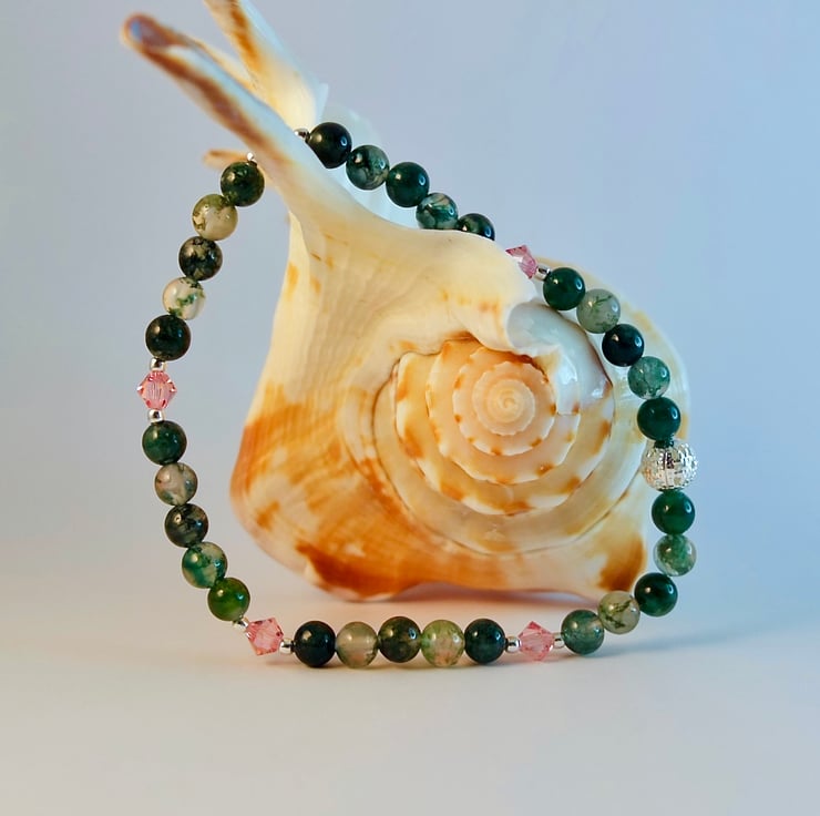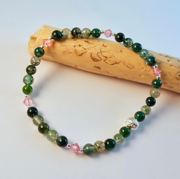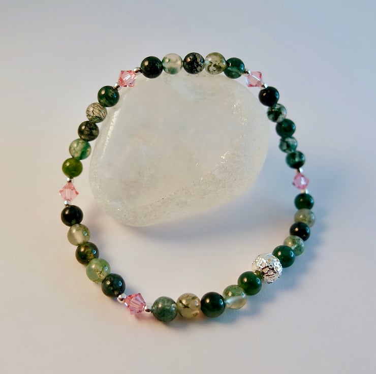 Dainty bracelet made from 4mm green Moss Agate beads dotted with 4mm crystal bicones, sterling silver spacers and a single 6mm Tibetan silver filigree bead