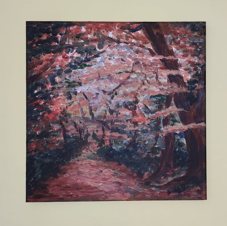 This original autumn forest landscape painting it's full of light, colour and texture, gently pulling you into the painting and along the tree lined path.