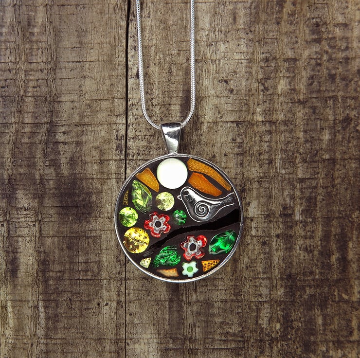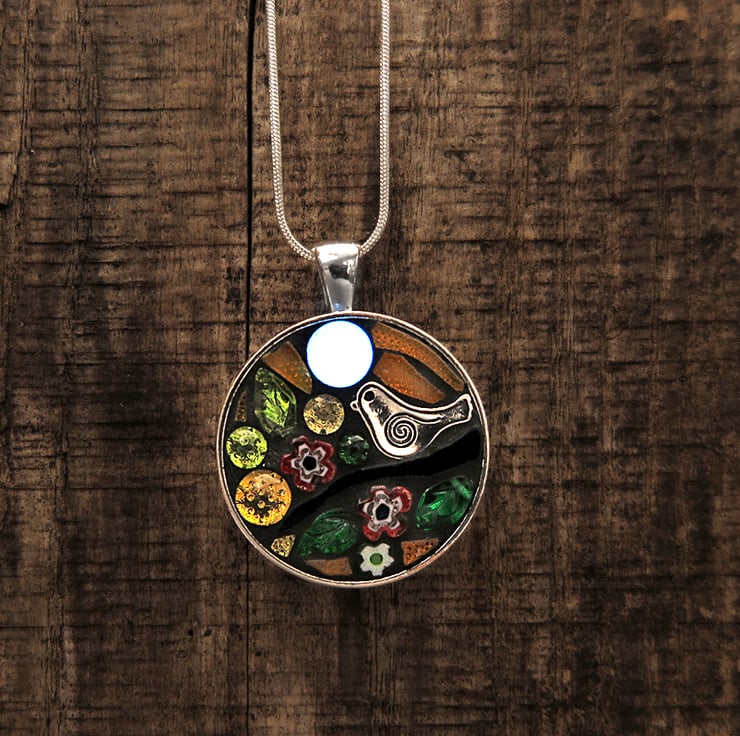 A handmade stained glass and bead pendant featuring a tiny silver toned bird perched in a tree with a glow in the dark glass bead to represent the moon.