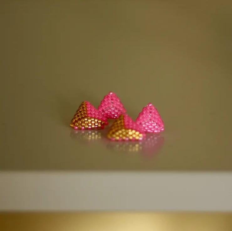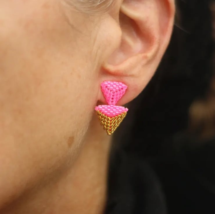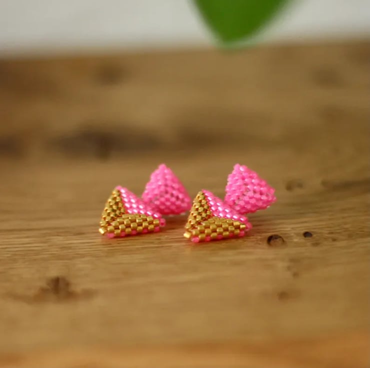 On a pink stud with stainless steel posts and silicon backs. They are hand woven in my studio in Cornwall using traditional beading techniques.