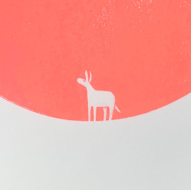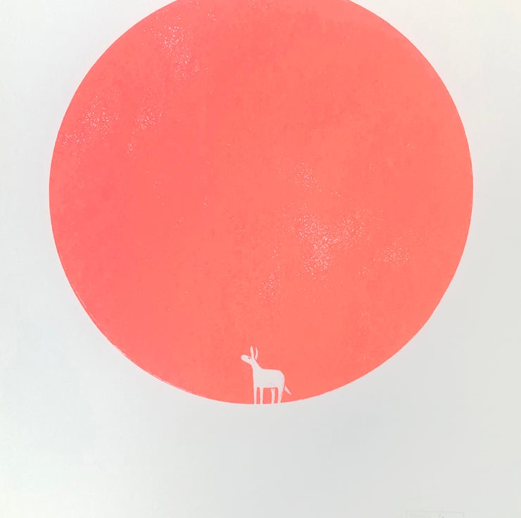 This is the twelfth print in the 'magic donkey' series, a continuation of my donkey dreamworld theme. I've always had a fascination with circles, using them in my prints regularly, and on this occasion it is the ultimate minimalist tribute! The donkey stands before a mighty circle. Is it a moon, a solid dot, a passage to another place? They will find out soon enough..